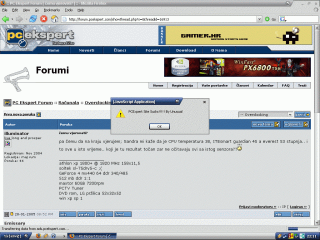 Ovo mi je iskočilo dok sam pregledavao forum,nije se moglo zatvoriti,ni na x ni na ok,ni sa mozillom se nije moglo ništa pa sam je morao killati u procesima.A mislim da sam vidio taj nick na forumu.Jel se još nekome dogodilo to? |