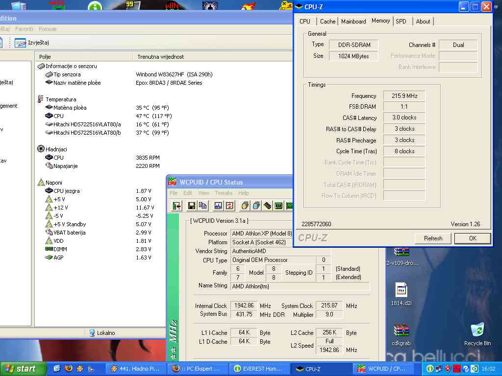 Evo i cpuz @Jeltz Nisam uzeo ST zato sto je ova mema cca 250 kn jeftinija i sto je netko na forumu (mislim da je bude) rekao da je isprobo kod frenda ST 1x512 mb i da niti ne pomislja da proradi na 2.2.2.5 pri 200 FSB-a. E onda je netko uletio na forum da je pqi dobar cak i bolji od talenta, i tako...jebiga popusio sam gadno.u kurac.