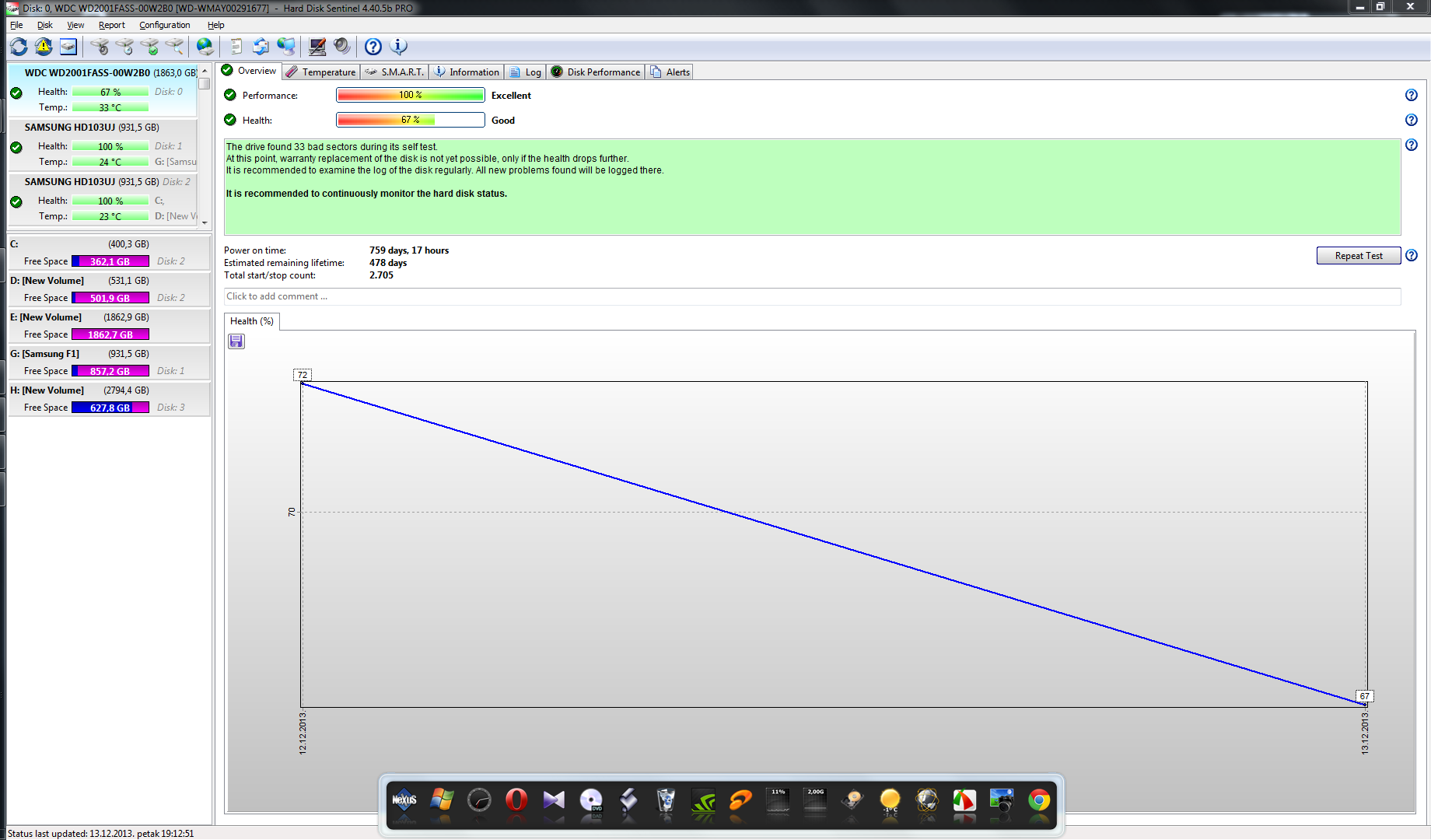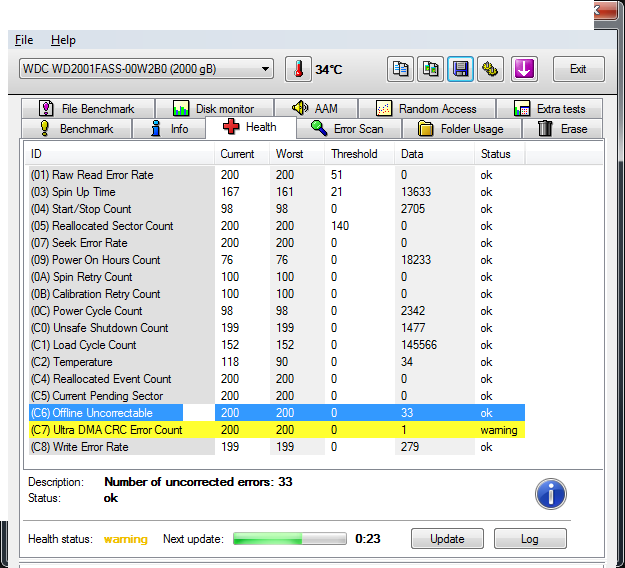 Prebacio sam podatke , instalirao sam i pokrenio HDD LLF Low Level Format Tool . Nakon formatiranja ću vidjeti što javljaju HDD Tune i Sentinel programi . Ako bude " 0 " pending sektora ponovno ću prebaciti podatke i pratiti ponašanje harda . Svaki savjet je i dalje dobrodošao ! ---------------------------------------------------------------------------------- Formatirao sam hard disk i sada HD Tune program pokazuje da ima 33 uncorrected erora , Sentinel pokazuje da ima 33 bad sektora , ali da još ne mogu reklamirati hard disk !? Dali je disk spreman za reklamaciju ?! Po mom mišljenju je definitivno spreman sa 33 bad sektora ! --------------------------------------------------------------------------------- Formatirao sam ga i sa Data Lifeguard Diagnostic for Windows , ali se ponovno pojavljuju nestabilni sektori ..... Niti jedan program mu nije pomogao da se u potpunosti oporavi i stabilno radi . Idući tjedan ga nosim na reklamaciju . Barem sam uspio spasiti večinu podataka ....... Zadnje izmijenjeno od: Kristijan1. 14.12.2013. u 14:50. |