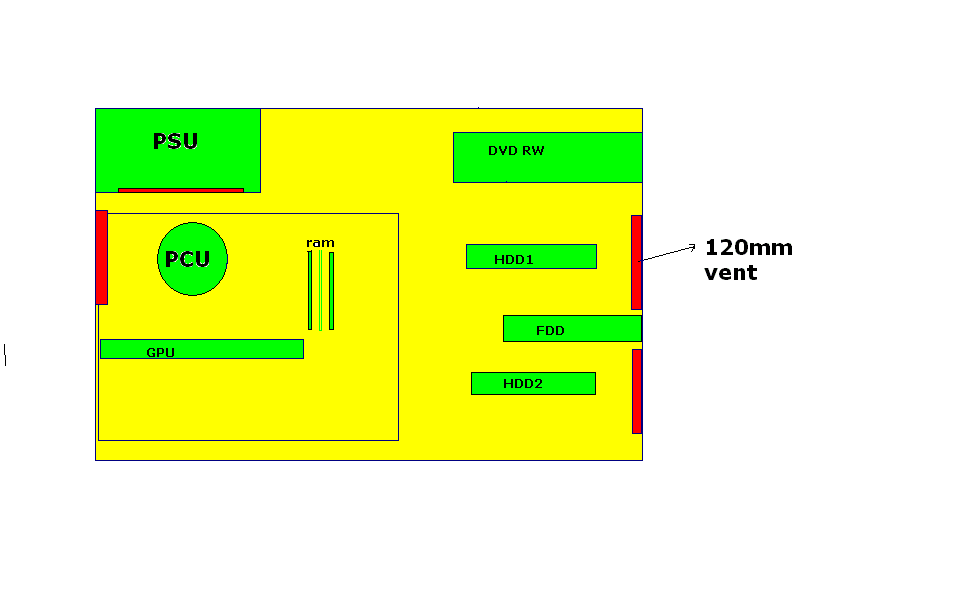 Meni je ipak logičnije da npr. HDD-ovi budu dolje jer je dolje hladniji zrak (koliko god to bilo minorno, ali je hladniji. Ja sam uvijek zamišljao nekako HDD-ove da su dolje i da je ispod njih ventilator jedan. Znači da je vent ne naprijed, već na dnu kučišta. Dobra mrežica ćuda radi, vent je tiši za korisnika negoli da je sprijeda. EDIT: Nešta ovakvog. Ovo sam sklepao na brzinu, pa ono, mjere nisu precizne. Zadnje izmijenjeno od: Vuco. 03.04.2007. u 19:29. Razlog: Dodao slikicu :) |