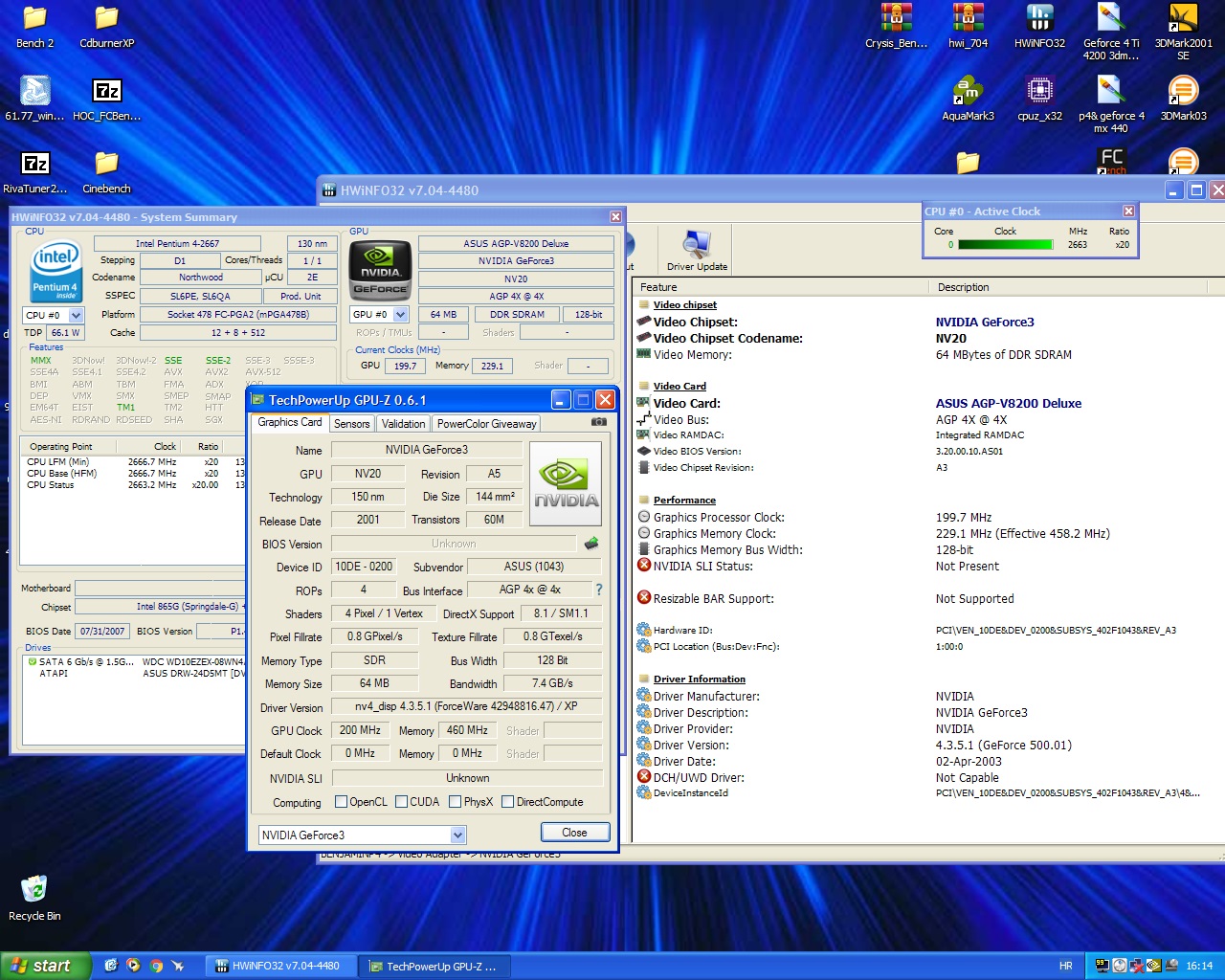 However nakon promjene paste i ciscenja kartice upalio sam i shvatio da se zapravo radi o original Geforce 3 a ne o TI 200 modelu. Asus V8200 Deluxe 64mb taktovi su 200 Mhz jezgra i 230 Mhz memorija umjesto 175/200 mhz za Ti 200 |