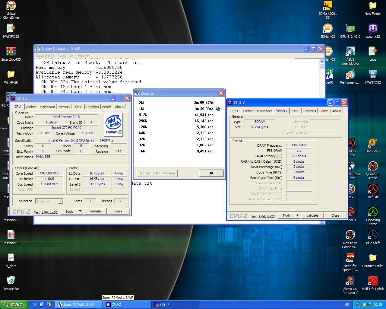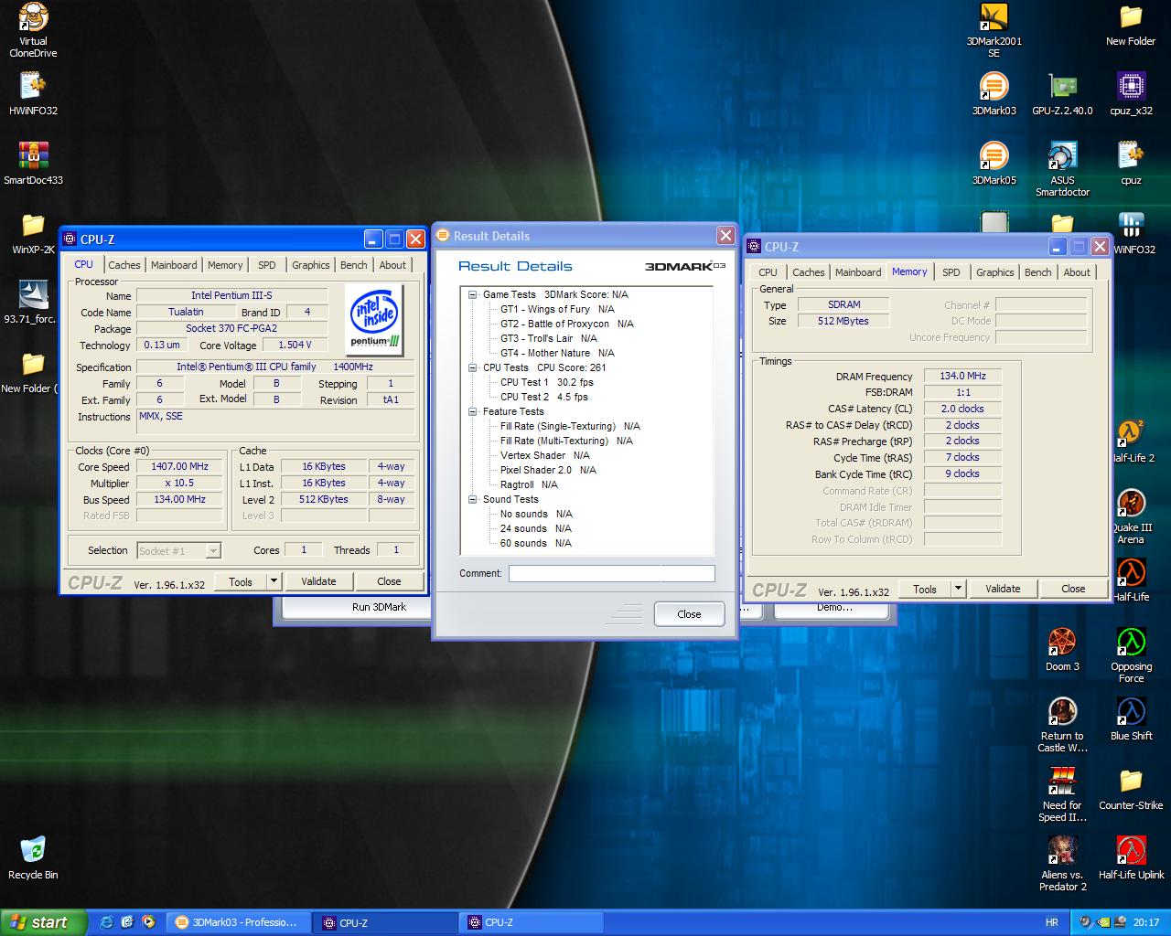 ![]() 3DMark 2003 CPU test: ![]() Passmark CPU: ![]() SuperPi: ![]() CPU-Z Bench: ![]() cca 2x bolji rezovi od Tualatina, negdje i više. Osim u Passmarku. Nisam se nadao da će biti toliko. |