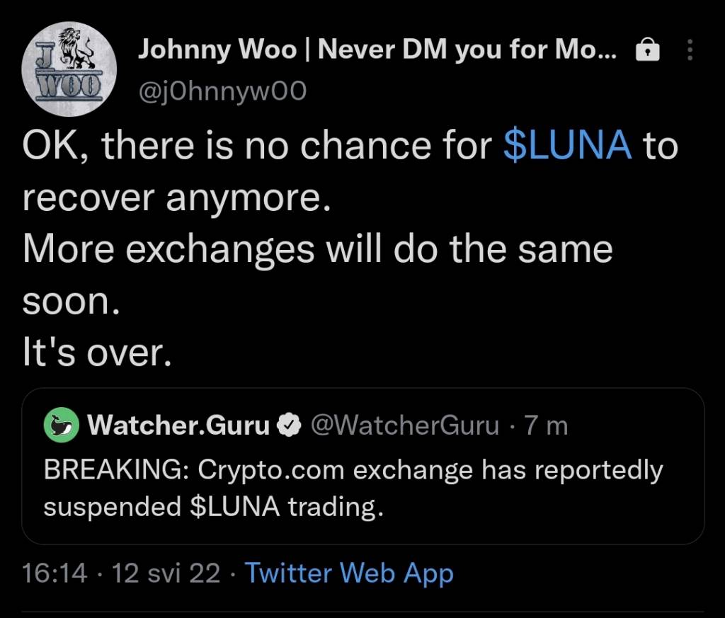 Tko je kupio BTC na 3K se isto obogatio, samo je trebao kupiti. Što je s ovima koji su jeftino kupili LUNA na 0,50? Mislili su da je super jeftino, kao ono kita ispod suknje. Cijelo crypto trgovanje je lako kada gledaš povijesni graf, kikiriki. Malo je teže kada je live EDIT: Baš gledam LUNA na FTX, najniže je bila na 0,01245$ što u prijevodu znači da je onaj koji je kupio na 0,02$ usro gaće kada je došlo na 0,01245 (-38%). |