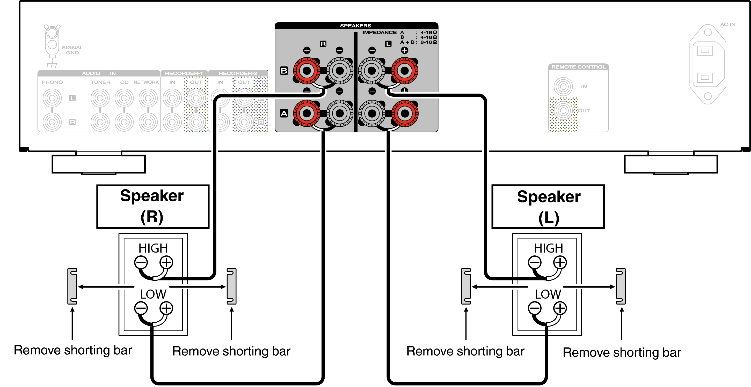 jedno pojačalo sa AB izlazima za zvučnike koji idu na tweet/bass terminale BEZ pločoce/brikne i ja koristim QED original kablove a i napravio sam si (pletenicu) od LAN CAT5 kablova i nisam čuo neku razliku...tako da to spajanje bi-wire ne koristim već dobrih 20 godina |