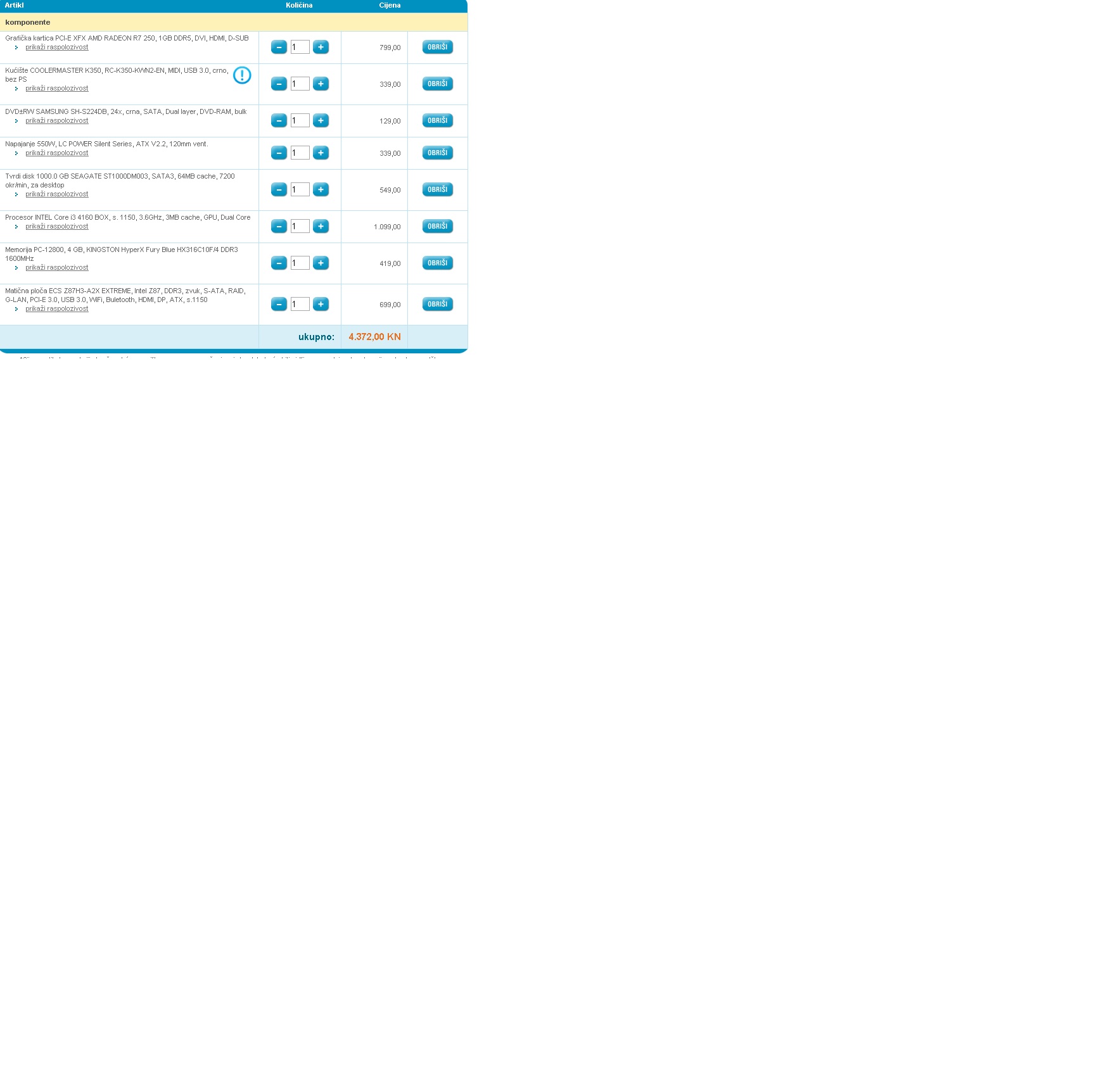 Kućište ANTEC VSK-4000B, MIDI, crno, bez PS Napajanje 450W, ANTEC VP450P EC Cooler LC POWER LC-CC-95 Procesor AMD FX X6 6100 BOX, s. AM3+, 3.3 /3.9GHz, 14MB cache, Six core Matična ploča BIOSTAR TA970 Memorija PC-12800, 4 GB, G.SKILL Value Series, F3-1600C11S-4GNS, DDR3 1600MHz =2762kn portio +akcija: http://www.portio.hr/index.php?route...iew&blog_id=80 Ukupno: 4361kn ->blower-tip ventilatora je dovoljan za ovu karticu(120W TDP) ->znam da ljudi baš nisu skloni Biostaru, ali ploča ima VRM hladnjake i 3 god. garancije, bit će dovoljno dobra ->4GB RAMa se još nadoda |