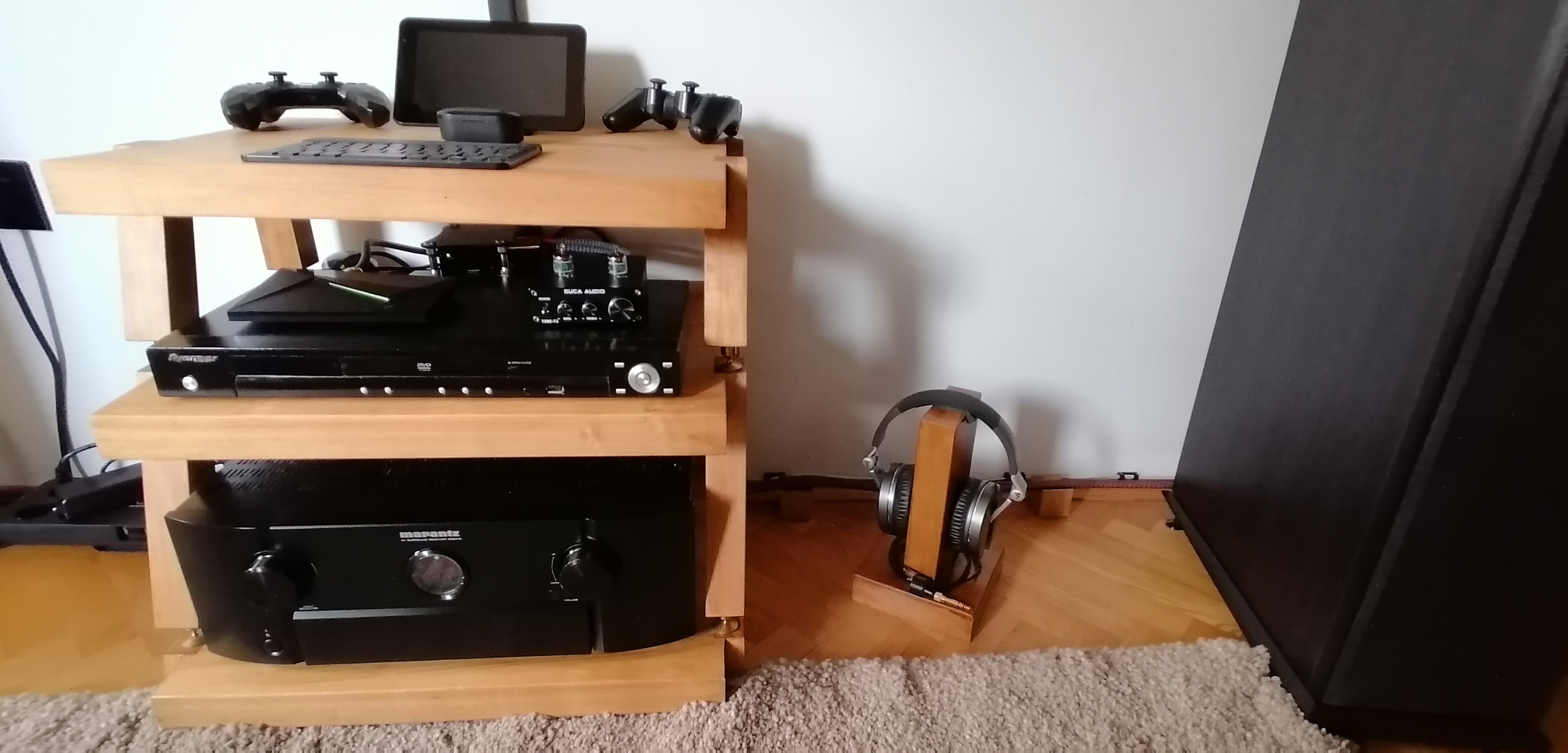 Rack je drveni javor(nije pticiji) , na siljcima od mesinga, napravio sam uz pomoc stolara. Na slikama se vidi sve. Svaka polica ima avob utor na zadnjoj strani.