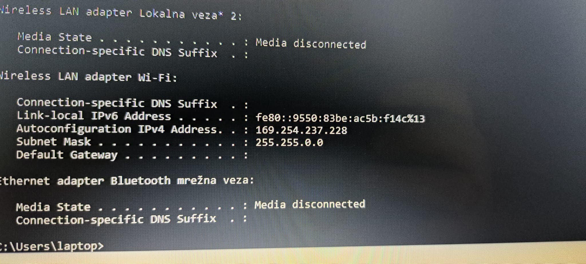 to sam napravio i prvi put ,stavio sam u 192.168.1.12 i onda nisam mogao više pristupiti routeru,pa sam ga resetirao i stavio 192.168.1.2 i sad opet ne mogu u router ...spojim se na wifi i dalje normalno, ali ne vidi mi tu adresu ni u cmd kad pingam...ipconfig kaže ovo na slici...