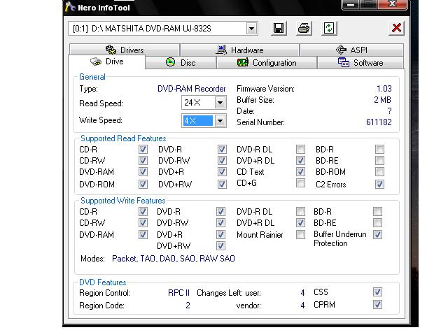 Ako je dosad sve radilo OK, možda je problem u nekoj softverskoj izmjeni. Imaš li instalirano što od emulacijskog softvera (npr. Alcohol, Daemon Tools), koje programe za snimanje imaš, koji točno firmware? Usput, ajd baci screenshot Nero Info Tool-a, kartice Drive.
