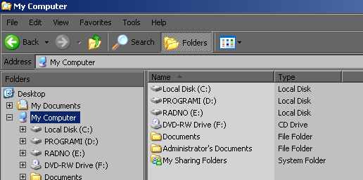 I nije neki problem al me extra zivcira. Nedavno sam promjenio workgroup u drugo ime (spojio sam se u mrežu wlan) i od onda mi se događa sljedeće: 1) prilikom logiranja javlja se welcome screen kojeg prije nije bilo (ja sam jedini korisnik kompa). Ako odem u user accounts i tamo izgasim WS, onda kad gasim komp javlja se onaj glupi prozorćić sa padajućim izbornikom za restart, log off.... i na ctrl-alt-del mi nije samo task menager već one full opcije koje su uveli win nt. Kako da izbacim WS a da sve drugo ostane kao prije? (znači da prilikom gašenja budu ona tri dugmeta za log off, restart i turn off) 2)u windows exploreru kada kliknem na my computer imam običan pogled kao u drugim direktorijima (slika). Prije je bilo podjeljeno posebno dokumenti, posebno HDD particije i posebno removable drives (dvd, usb...). Kako vratit na staro? (Views nema veze....) Windoze su XP pro SP3 slipstremane sa nLite-om Hvala |