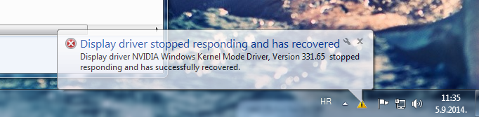 Pozdrav, Imam problem s PC-om nakon nekih 20-30min korištenja, pocinje se zamrzavati na 10sec i to svakih 45-60sec. Dolazi mi i ova napomena (kao na slici): Display driver stopped responding and has recovered. Što napraviti da se ukloni to zamrzavnje, jer je gotovo nemoguće raditi na PC-u? |