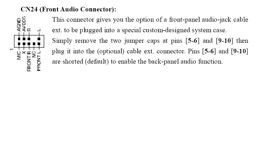 Kao što sam rekao, uspio sam dobiti zvuk na prednjoj strani (na slušalicama) i nikakav zvuk sa stražnje strane se nije izgubio, tj. čuje se istovremeno i na zvučnicima spojenim na stražnjoj strani i na prikopčanim slušalicama na prednjoj. Što se tiče manuala, ona slika koju sam postavio u prvoj poruki je uparavo iz manuala i to je sve što se tiče spajanja tkz. front panela. Iz toga se vidi da su oznake na matičnoj drugačije nego na kablima, pa sam zato tražio pomoć u vezi spajanja da dobijem i mikrofon. HVALA |
