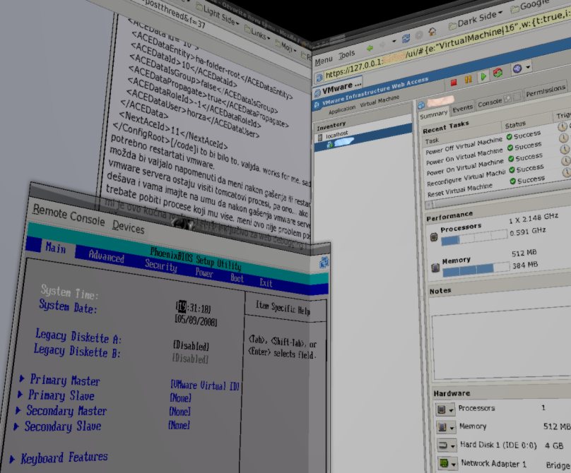 možda bi valjalo napomenuti da meni nakon gašenja ili restarta vmware servera ostaju visiti tomcatovi procesi, pa ono... ako se dešava i vama imajte na umu da nakon gašenja vmware servera trebate pobiti procese koji mu vise. meni ovo nije problem pošto mi je ovo kućna mašina i služi isključivo za web debugging i slične gluposti koje radim jednom tjedno. tak da ono... vmware server mi je stalno isključen. opičite firefox ili neki drugi dobar browser (npr. firefox 3 ili firefox 1.5) i otiđite na adresu:https://127.0.0.1:443 ako bude sreće, nešto će se otvoriti. ako ne bude, pokušajte restartati cijeli komp ![]() ako bude sreće, uspjeti ćete se ulogirati sa svojim username-om i passwordom ![]() i onda na snagu stupa divni novi webui. bio je totalno šugav u verziji vmware server 2 beta 1, ali sad mi je odličan. čak i na daljinu ![]() to je sve. dalje je kliketuša ![]() i nek mi onda netko kaže da vmware server 2 beta ne radi pod ubuntu-om ili još gore, pod hardy-em (internet je pun takvih napisa i očigledno je da nisu točni).