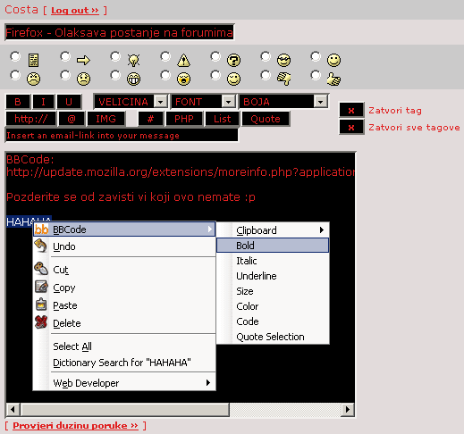 BBCode ekstenzija za Mozillu - Olaksava oblikovanje postova na forumima