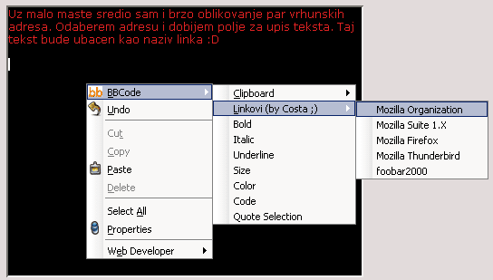 Uz malo maste sredio sam i brzo oblikovanje par vrhunskih adresa. Odaberem adresu iz izbornika i dobijem polje za upis teksta. Taj tekst bude ubacen kao naziv linka Mogucnosti su prevelike ![]() Mozilla