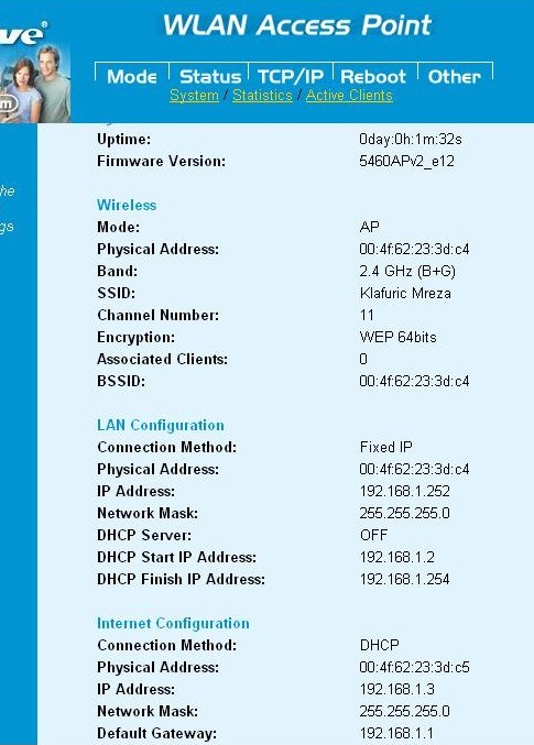Prema ovome mi izgleda da je veza thomson<->airlive uspostavljena i to bi trebalo biti OK. Sada napravi ono što se inače ne preporuča, a to je dvostruki NAT: 1. Promijeni LAN IP adresu Airlive-a nazad na 192.168.100.252. 2. Uključi DHCP server na LAN strani. 3. Promijeni SSID na Airlive-u da bude različit od onog na Thomsonu. Nakon ovoga bi se trebao moći spojiti i LAN-om i Wirelessom na Airlive i preko njega na internet. Susjedi bi se isto trebali moći spojiti ako je signal dovoljno dobar. Dvostruki NAT bi ti mogao stvoriti probleme ako budeš htio forwardirati neke portove susjedima, ali ne nužno. Mislim da ga nećeš moći izbjeći s ovim Airlive-om, barem ja nisam mogao kad sam pokušavao nešto slično. |