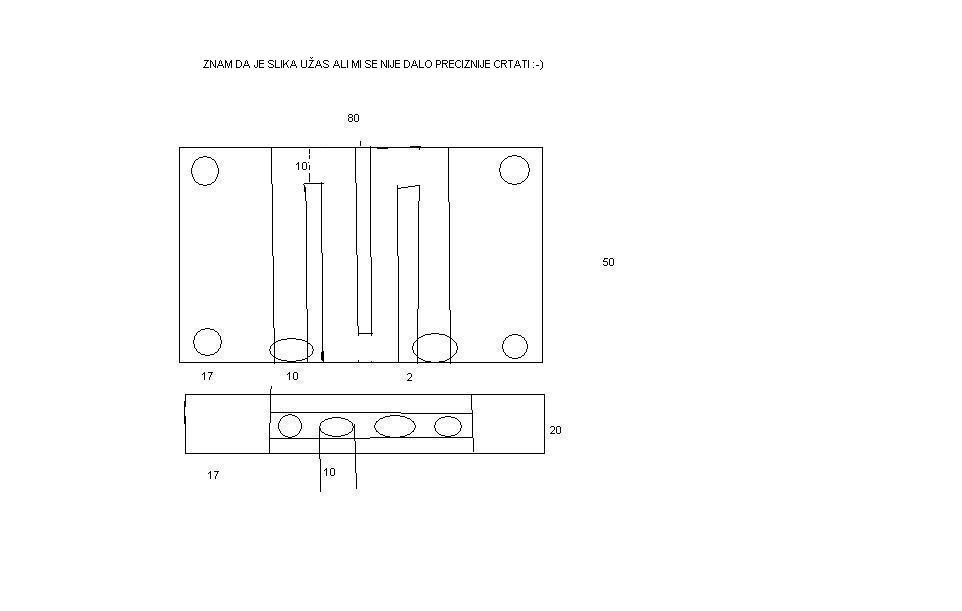 Koliko vidim debljina bakra ti je 20mm! ajd posalji meni barem 15mm rupe su 10mm, sto nije problem. Problem je u tome sto je previse bakra izmedju procesorske jezgre i vode (20-10)/2=5mm sto je mozda malo puno, bilo bi dobro kad bi izbrusio donju stranu, ali opet ne previse. Ima ovaj tvoj blok i dobru osobinu a to je da ako pumpa stane, obzirom na CPU od 800MHz vjerojatno se nista nece dogoditi jer imas toliko bakra