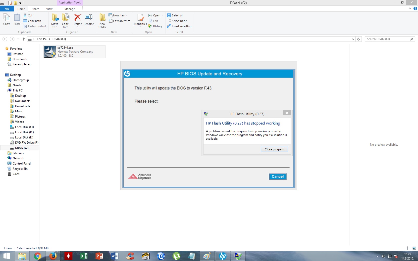 Više ne znaš bili se smijao ili plakao od muke, kao da se natječu napraviti neko sr ** e, probaj po kompu naći (vjerojatno među temporary folderima) gdje je raspakirao taj tool / paket i u njemu Bios file, vjerojatno ćeš trebati privremeno u File Exploreru omogućiti prikaz Hidden foldera i fajlova, kad nađeš Bios file prekopiraj ga na neki usb stick, pa probati napraviti update iz samog Bios - a, dakle ne iz winsa, to bi trebalo raditi po ovoj proceduri > http://support.hp.com/ro-en/document/c00042629 video > https://www.youtube.com/watch?v=72uwa0OZPPw dl. na jednom kompu / lapu na stick pa ga prenosiš na problematični lap, poželjno (potrebno) da je stick formatiran kao FAT32, obrati pažnju da se na prvom kompu / lapu samo dl. i raspakira ovaj SP paket a ne pokreće sami Flash Utility. Na kraju ostaje u zadnje vrijeme aktualno pitanje dali nova verzija Bios - a rješava tvoj problem ili će ti uvaliti neki drugi biser / problem, pogotovo kad vidim napomene treba / mora zbog W8 ili W10 smetja. |