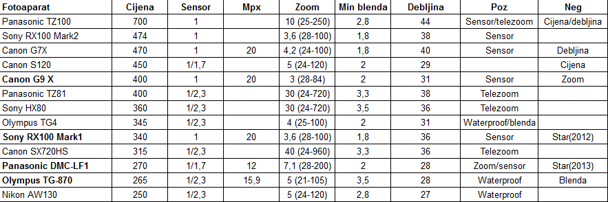U prilogu tablica koju sam slozio, ako ce nekome pomoci ![]() Gledao sam i G7X, koji takoder nije jeftin, a i vec ga se tesko strpa u dzep traperica |