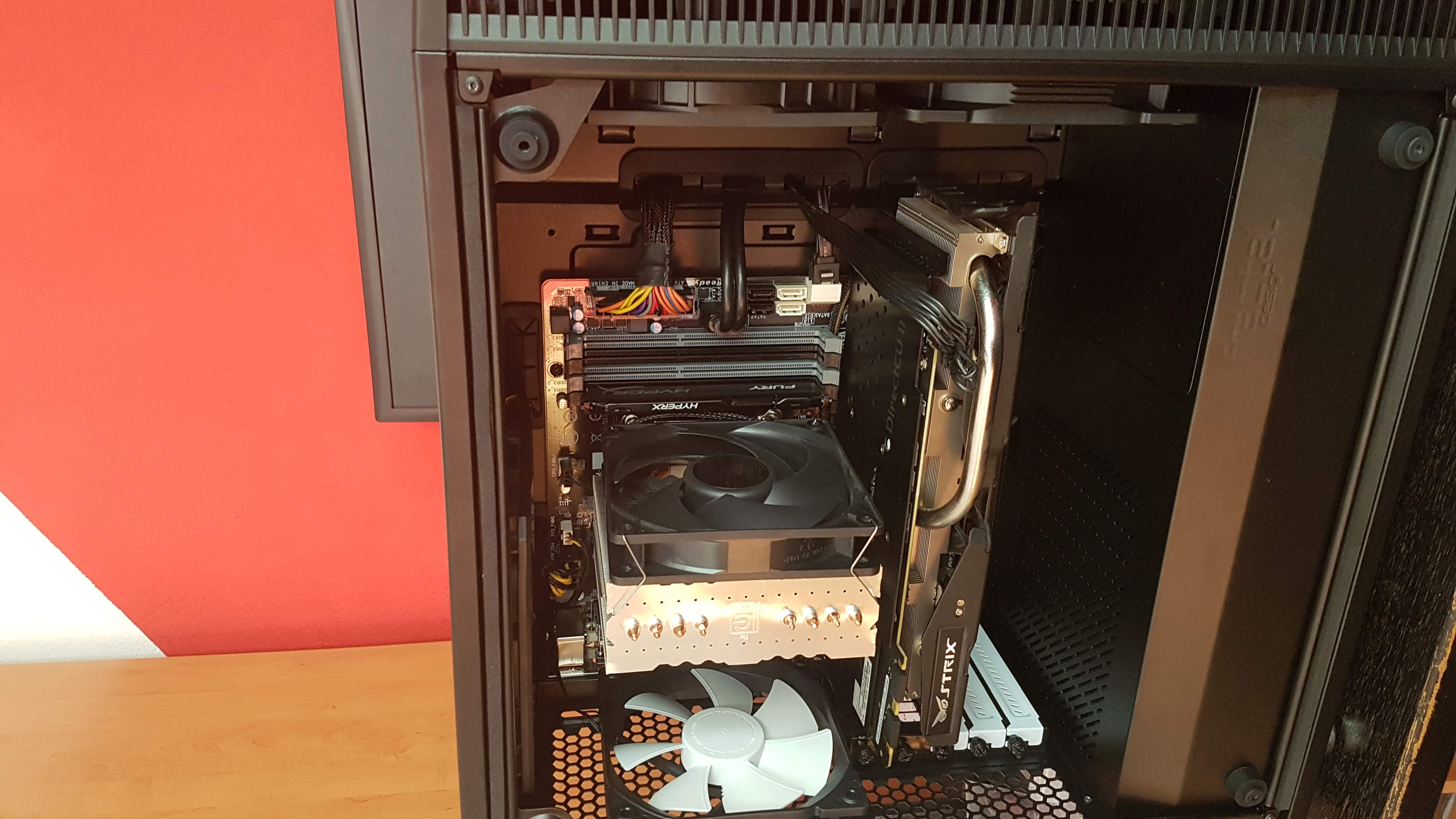 Za ovu temu izgleda dobro, boje nisu bitne, al može se tu još par stvari bolje odraditi. Kablovi koji vode do grafe se mogu kompaktnije "presavinuti", tako da nema dugačkih lukova. Pošto su plosnati kablovi, mogu se povući paralelno sa stražnjom stranom PCBa. Ova petlja drugog PCI-E kablića sigurno se može nekako bolje prikriti. SATA kabel pod 90° iz matične se može provuć da ide direktno u ovaj gumeni otvor, a ne da prvo ide prema gore pa negdje nestaje ispod grafe. Kabel na matičnoj tik iznad napajanja bode oči i konfuzno je uopće kako je što spojeno tu, pretpostavljam front panel. Da se i to sakriti pod matičnu i izvući tik do konektora.