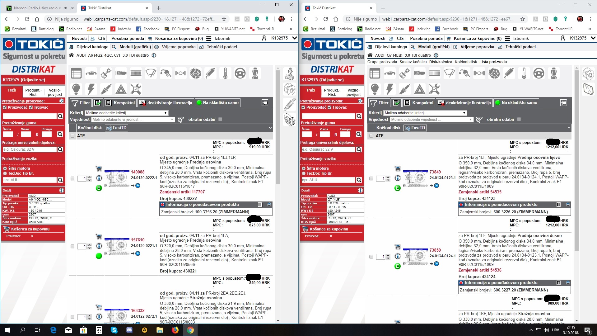 Ja tebe nit spominjem nit vrijeđam, a to što ti imaš neki poremećeni pik na to što ja pišem, ha gle, imaš ignore opciju Ja sam napisao SVOJE mišljenje, Gabre SVOJE, forum je ovdje da se RASPRAVLJA, a ne da svi imamo mišljenje ko kim young un .Evo, ja ću ti napisat, KAO I UVIJEK, ARGUMENTIRANI odgovor na ovo što se tiče cijena dijelova suv istog proizvođača i njegov otprilike pandan također istog proizvođača, pogonjeni ISTIM motorom. Znači namjerno uspoređujem različitu kategoriju vozila, ali istog pogona i iste motorizacije, a vrlo slične neto nabavne cijene vozila za krajnjeg kupca. Na žalost nemam kod tokića još uvijek cijene za cx5 vs mazda 3 da ti to usporedim jer su ipak za japance tj dijelove za njih najjači u hr japanparts momci aka pegas po novom, a oni nemaju ovako detaljan onlajn katalog kao tokić, nego su cijene i dijelovi samo na upit. Pošto smo pričali tu većinu vremena o a6 vs q7, upravo zbog sličnosti u svemu a različitosti u 'ogromnoći' suv-a, njihove cijene za banalne stvari tipa diskova, disk pločica ili ramena ovjesa ti prilažem u fotkama. Postotak razlike u cijeni si sam izračunaj ali vidit ćeš i sam da se radi i o više od 20%. Pa uzmi razliku u cijeni guma, pa disk pločica, pa diskova, pa samo jednog ramena ovjesa, a ne mijenja se jedno u većini slučajeva, pa ćeš vidit do koje cifre na godišnjoj/dvogodišnjoj bazi dođeš (podrazumijevam da se ne voziš u autu 5000km godišnje nego minimum minimuma 20ak ili više ako već teoretiziramo o kupnji i/ili isplativosti nekakvoj takvog vozila). Dapače da ima situacija i cijena dijelova koji su podjednaki i za limuzinu/karavan ili suv pandan istog, ali u velikoj većini nije tako nego su razlike u cijeni povelike na štetu suv vozilice. I nemoj bit tako ogorčen na ljude, državu i sve ostalo, dobit ćeš infarkt od živciranja . Ali i tu ću ti reći da je razlika u cijeni registracije auta od 150ks i auta od 250ks samo parstotina kuna GODIŠNJE. To je najmanja briga koja nekog treba smarat ako se dvoumi između takvih vozila. U točenju bi se isto iznenadio koliko malo troši U PROSJEKU jedan 3.0tdi na 150-160kmh na autoputu u usporedbi sa npr 2.0tdi od 150ks. Grad je druga priča .Cijene koje mi imamo za radionu sam namjerno sakrio jer nam Tokić ne dozvoljava objavu istih, to je interno, a i nebitno za ovo što želim prikazati i pojasniti.