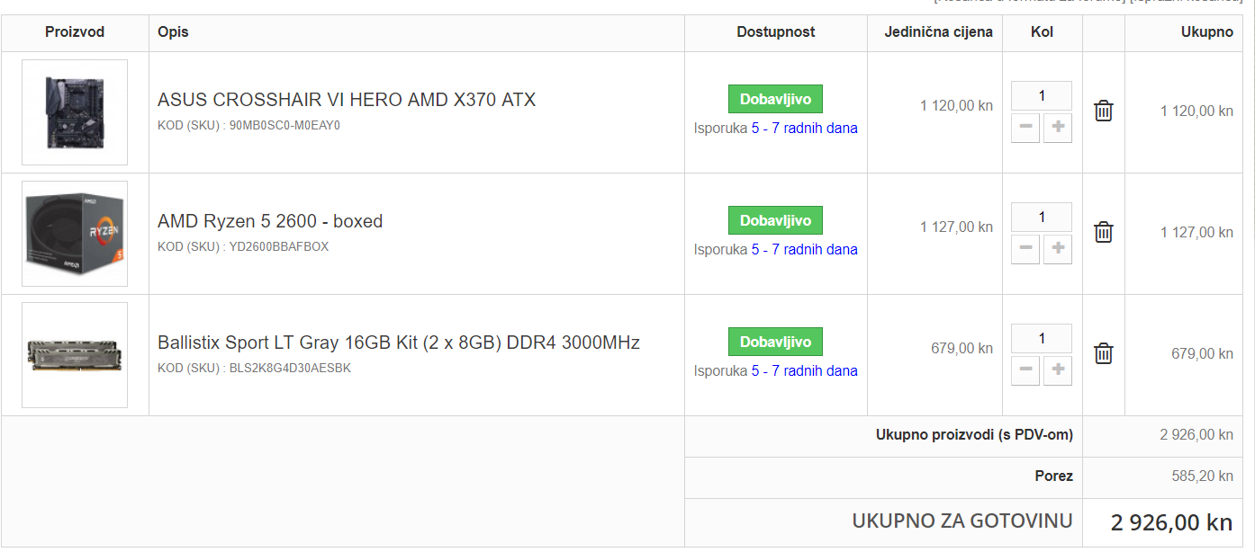 Baš sam išao računat, i ta ploča, r5 3600 i macho rev B bi me izvana došli 100injak kn jeftinije...nije mi se dalo zezat(mindfactory nemaju ploču, a pogledao još caseking i alzu). |