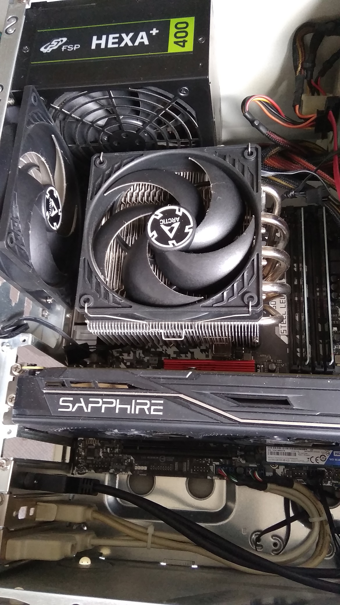 OK, prvo malo o kućištu i protoku zraka. I jedno i drugo je daleko od optimalnog (vidi slike). Aidu nisam probao, Prime sa ovim hladnjakom (koji btw nije ni blizu hiend Noctue ili nekog vodenog) se nakon 5 min zabije na 75°, pa nakon 45 min se popne na 90°. Kanta stoji pod stolom pa se pri tome skoro pa uopće ne čuje. A ionako je prime opterećenje kojim se osobno ne bavim. Blender npr. nikad ne ide preko 80°. Gaming (NFS, samo to igram) 70°. Možda bi mogao ići još niže sa voltažama, no nemam živaca još više petljati po tome. Štoviše, mislim da ću sve vratiti na default. Za moje potrebe je i to overkill.