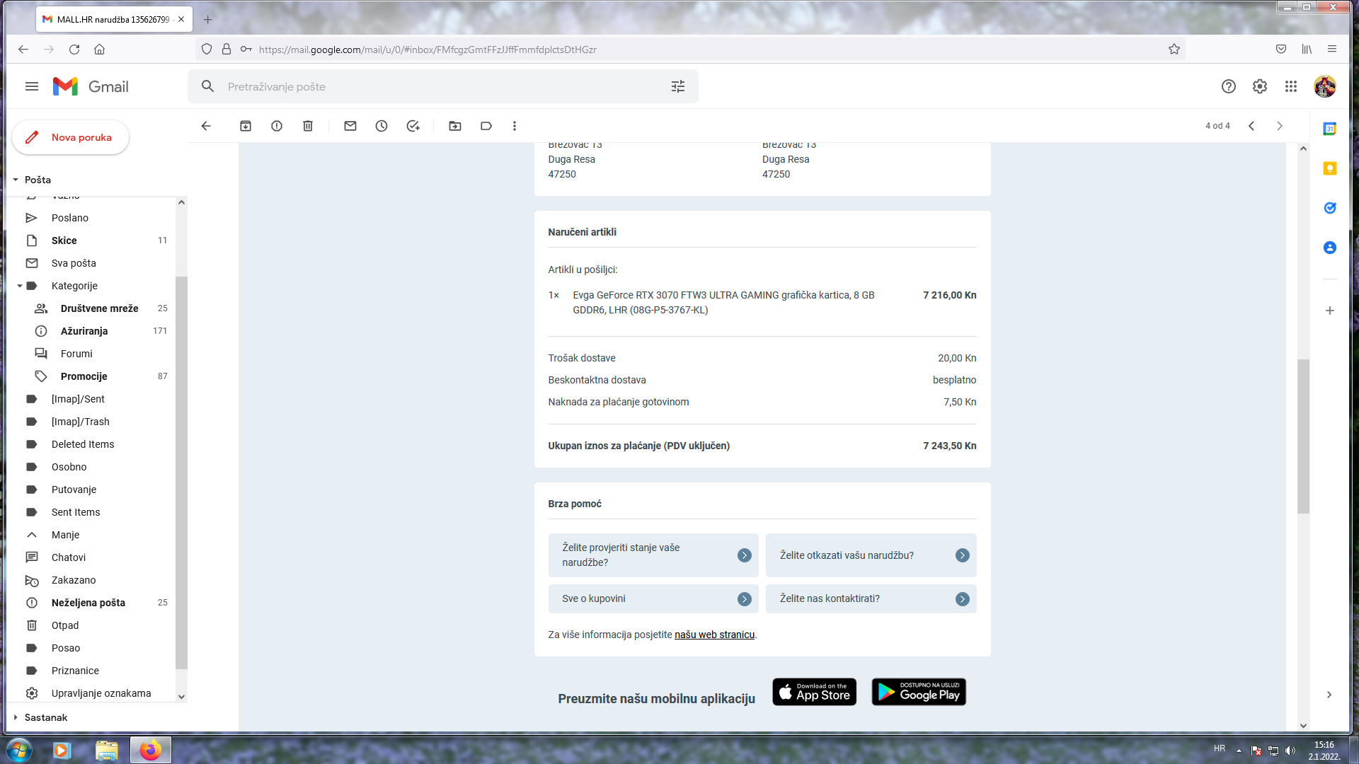 Vjerojatno ti bude došla jer ja imam sličnu situaciju od prije par dana s njima za dvije zadnje grafe na stanju i obje su mi poslali. ![]() Ova grafa koju si uzeo je jeftinija i od moje Gainward 3070 koju sam prije par dana uzeo u DE za 999€. ![]() ![]() Trenutno se ažurira stanje, tako da dok ti kupiš, neko iza tebe više ne može ubaciti u košaricu (nestane sa stanja). Da sam vidio pokupio bi ja tu zadnju. ![]()
