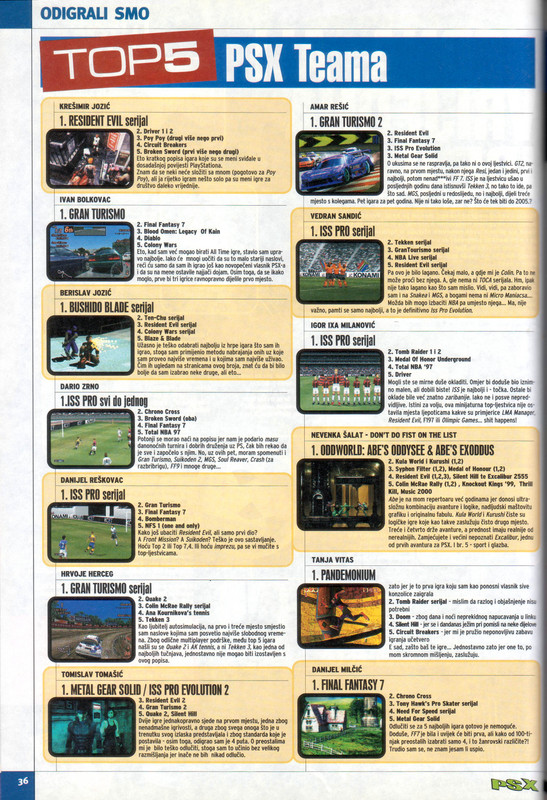 ONI ko što kazah, nisam igrao, no nakon ovog osvrta svakako planiram neki walkthrough pogledat, ili bar neku dobru recenziju. Pak Giantse jesam na ps2 (zadnje sam krenuo radnje prolazit prije 10ak god. al stao negdje na pola) i tu je inovacija bila da ko što je rečeno, lik sa naslovnice Delphi je samo trećinu radnje, dok su tu još nekakvi Meccharines, ko ljudi al u skafanderima i sa klasičnim pucaljakama (Delphi neke čarolije baca), te taj Kabuto, div visine 10x običnih likova koji okolo po mapi sve gazi i razjebava, čak može i jesti neprijatelje (!) da bi si health obnovio, no od 3, ti Mecchyiji s početka su mi nekak bili najdraži. Nemogu se sad sjetit radnje u čemu je fora, kako su ta tri lika povezana i protiv kog se bore, al ima neka ok priča. Mape i njihova otvorenost u neku ruku podsjećaju na Terracon sa ps1 (naravno samo grafički jače), jedna istodobno od tehnički najnaprednjih igara za konzolu i izašla u zadnjoj poplavi ps1 hitova, mislim da je kasna jesen 2000. No, da se ide uzet ekvivalent usporedbe i da je netko nešto ko taj Terracon za ps2 radio, toliko optimiziranu i naprednu igru recimo 2005. mislim da bi pali na guzicu od grafike, jer 2001. sigurno još nisu izvukli sve atome snage iz ps2 i programerske trikove naučili. -- Nisam komentirao gore u broju, ali u najavama, čak i na naslovnici, se spominje nekakva rpg strategija Volfoss. Prvo mi je bilo ček, pa kaj je to, kak se za to nezna, i naravno: igra nikad nije izašla van Japana, iako u najavi se navlači da "ovo bi mogla biti najbolja strategija na Playstationu". No, čak je i caveat u zadnjoj rečenici ostavljen, "da je Namco najavio samo u Japanu", uz wishful thinking da "takvim igrama ne treba mnogo za prelazak Tihog oceana, na američko tržište. Moš si mislit. Malo kolko sam guglao, iznimno maštovite ilustracije likova, to je valja po nekoj mangi. Uz sve ovo, u broju je i TOP 5 igara PSX recenzenata, pa ću to ovdje staviti ako netko možda treba inspiracije za što igrati ili probati da već nije. Vrlo je vidljiva dominacija kod nekih likova ISS Pro serijala, no malo me stara psx iskusnjara Bero iznenadio; Bushido Blade nisam percipirao nikad kao neki svevremenski klasik (zna li netko Hacker gdje je on to recenzirao, ako je?). Posebno su me razveselile Nevenka koja je dodala na listu nezavršeni sadistički Thrill Kill, te Tanja da se napucavala masovno u Doomu s link kabelom (treba 2 konzole i 2 TVa), što je vrlo bilo zastarjelo u svjetlu igranja Dooma online u deathmatchu, no ta neka ograničenja ps1 su imala svoju čar. Malo sam si vrtio koji bi meni bio top 5 sa PS1, od odigranih (neke ne i komplet prođene doduše) sigurno 200 igara... Znam samo koja kategorija odma ide van - bilokoji nogač ![]() |