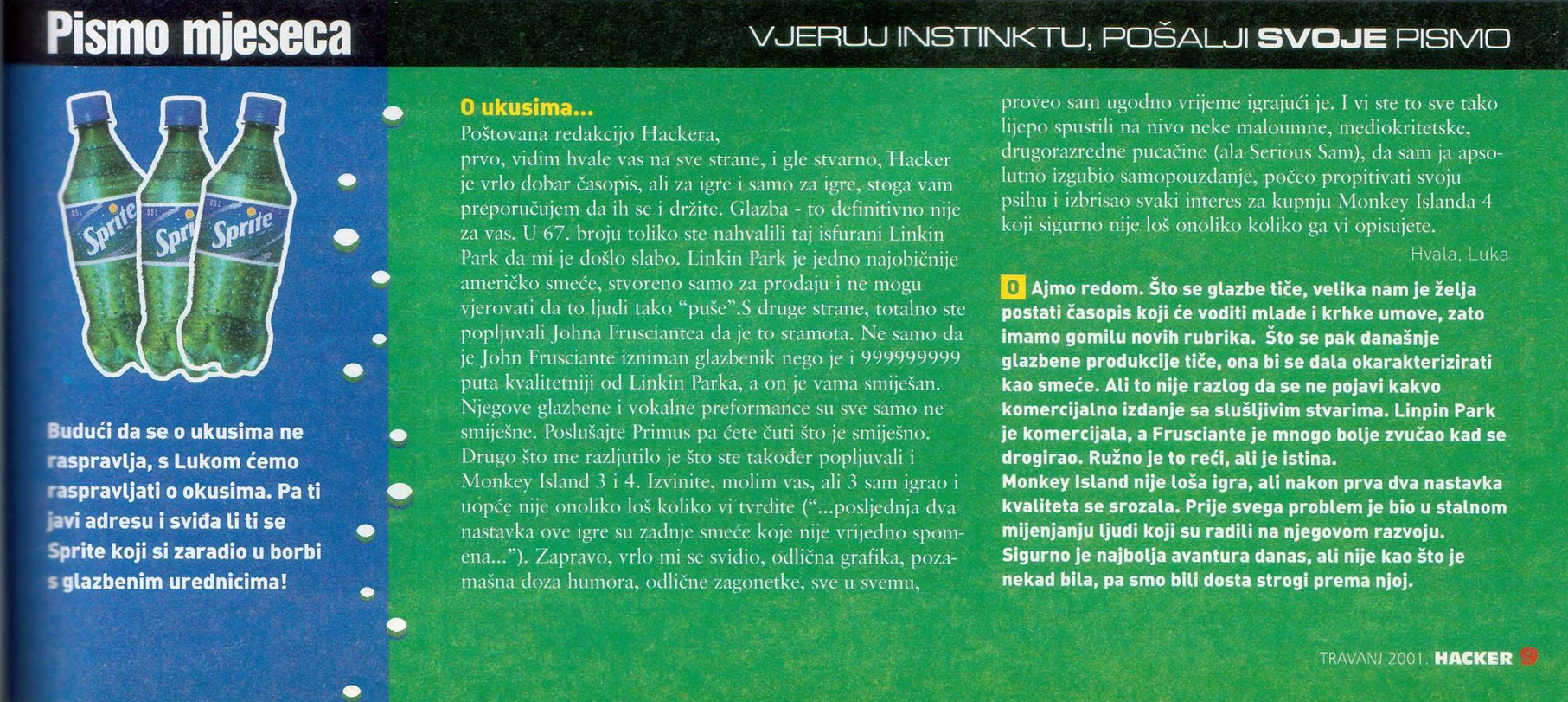 Trenutno je ožujak, a eto nam novog Hackera iz travnja (mislio sam pričekat još mjesec dana s objavom da bude prigodnije, no spice must flow!), iz 2001. dakako prije nevjerojatnih četvrt stoljeća; broj 68. ![]() U vezi naslovnice, prilično je drugačija i zgodna, iako sa simplificiranim crno-bijelim tonovima, praktički motiv i vibe kao neka tribal tetovaža. Dosta ima hype teksta oko Unreala 2 (stigao tek 2 godine kasnije s meh efektom) i najavom pregršt XBOX igara, a od kultnog hardweraja tu je najava GeForce3. Igra broja je naravno Black & White, istu nažalost nisam nikad igrao pa ne mogu previše komentirat, no zapravno ono što me najviše iznenadilo u broju, (pogotovo jer uopće nije naglašeno na naslovnici, nego tek na dnu s malim slovima) sljedeća recenzija je najuspješnije hrvatske PC igre, "kultnog" Serious Sama , što je s obzirom na hype i domaću važnost same igre nekako čudno i neshvatljivo. Moguće da je između Hacker crewa i developera došlo do nekakvog "falling out-a" da se više ne naglašava toliko S.S. a i sama recenzija na 48. stranici je tako nekako intonirana, prije svega Lauš se već u uvodu čudi kao finalnom proizvodu što se odvija samo u Egiptu, jer su kao oni dobili tijekom razvoja dugogodišnjeg dojam da će biti i pregršt drugih lokacija. No, na kraju očito lišeno nekakvog lokalpatriotizma i boostanja zbog toga, ocjena od 87 je zapravo korektna i realna. Ostatak broja, tu je Summoner, ujedno jedan i od prvih ps2 RPGa, kojem je Rukavina dao i dosta više nego što je ps2 verzija prosječno dobivala - 90 (čini se da je ps2 verzija prerano puštena, a za pc su stigli sve ispolirat i uredit), te još par nekih ok igara kao Settlers 4, Fallout Tactics te Desperados. U Helplineu je prohod Dink Smallwooda koji je postao unas najpoznatiji zbog Hack cda u kojem su full verziju igre objavili. download: https://www.sendspace.com/file/uyy4cl |