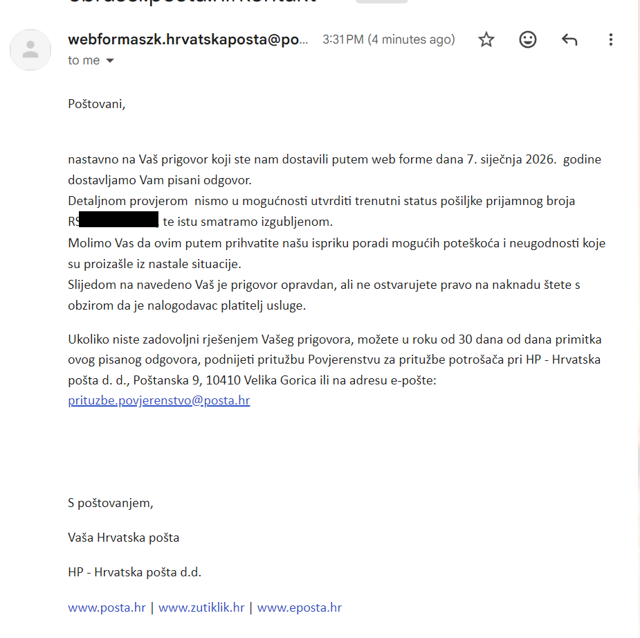 Dakle HP mi je zagubio paket vrijednosti $68. Paket poslan 19.12. iz Latvije i kako dugo nije dolazio, računam da je to zbog praznika koji su se naredali i gužve jer svi šalju pakete. Jučer im pošaljem upit na email, jer ih se na telefon uopće ne može dobiti (čekao 19min, na kraju je jednostavno pukla linija). U prilogu je njihov odgovor. Da li je tko imao slično iskustvo i šta mi je činiti? Hvala. |
