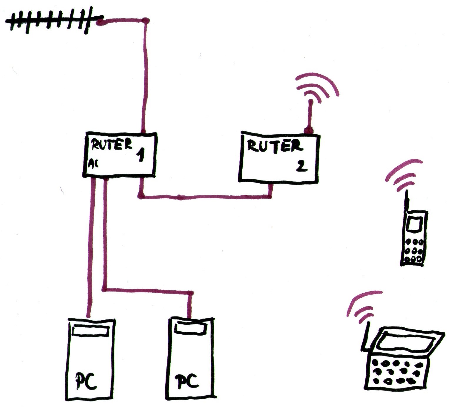 Imam pristup internetu preko TENG-ove bežićne mreže. Signal preko yagi antene dolazi do rutera (ruter 1), koji je podešen da radi u klijentu modu, pa tako da onda radi kao access point. Od rutera (ruter 1) do PC ide mrežni kabel. Da li je moguće i kako napraviti kućnu bežićnu mrežu, tako da na jedan mrežni kabel spojimo drugi ruter (ruter 2), a na laptop bežićnu mrežnu karticu (wilerres).
