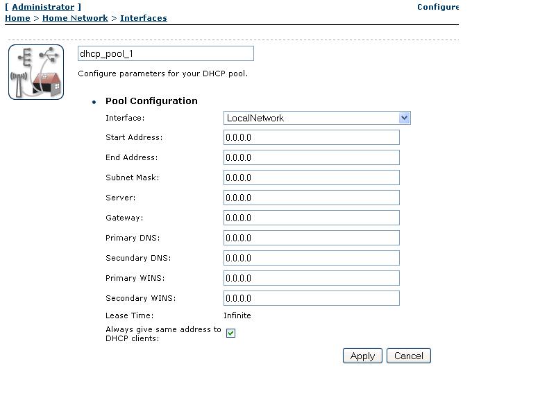 Start Address: 192.168.50.x End Address: 192.168.50.y Subnet Mask: 255.255.255.0 Server: 192.168.50.1 Gateway: 192.168.50.1 Primary DNS: 192.168.50.1 Secundary DNS: Primary WINS: Secondary WINS: Lease Time: Infinite DNS – ili neki drugi željeni Zadnje izmijenjeno od: thopok. 10.04.2009. u 15:57. |