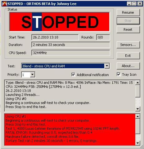 za pocetak nauci koristit opciju "Edit" i nemoj spamat po forumu dalje, idemo rijesit problem... znaci koja ti je voltaza rama? iako nebi trebalo biti bitno jer je tek sada na default frekvenciji jesi li siguran da su ti sve 4 plocice ddr400? najvjerojatnije je problem u procesoru, treba mu jos voltaze, pa odi u bios i stavi 1.685v i vidi koliko ti kaze u cpu-z i opet pokreni orthos, trebo bi duze izdrzat kao nista drugo, kasnije odi i do 1.7v u biosu, dok god u cpuz-u ne pise 1.65v, preko toga ja ne bi iso za 24/7 rad |
