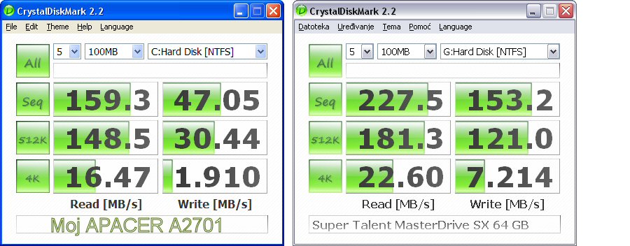 Citajuci malo po forumima i tako to, odlucio sam svoj sistemski disk zamijeniti sa SSD diskom, a taj "stari" obicni 3,5" disk pretvoriti u storage. Nabavio sam (Protis) Apacer A2701 disk od 32 Gb i veselio se stavljanju istog u pogon. To radi vise-manje dobro, ali svakako sam vise ocekivao od SSD diska. Nasao sam benchmark od nekoga koji je tu na forumu prodavao SSD disk, nemam pojma vise tko je to bio, mozda "Tomy B." i probao napraviti svoj sa istim tim programom, odnosno sa CrystalDiskMark-om i podaci su porazavajuci. Na slici u atachmentu su benchmark mog i njegovog diska, a brojke govore i previse.![]() Na slici se vide njegovi i moji rezultati. Je li moguce da je Apacer disk toliko losiji od 'Super Talent' diska koji opet bas i nije neka marka? Ili moj SSD disk ima neki feler, pa da ga reklamiram? ![]() Disk je sistemski, odnosno na njemu su instalirani windowsi XP SP3. Relativno dobro radi, u stvari prilicno dobro, kad je otvoren samo jedan program i radi se u njemu, ali ako rade dva ili vise procesa istovremeno... katastrofa. Npr. kad se instaliravaju windows update-i, i surfa nesto sa Firefoxom, to postaje nepodnosljivo. Cim disk mora raditi na vise mjesta paralelno, komp radi k'o dobra stara 386-ica.![]() A i kad sam vec tu... Jos jedno pitanjce. Kada je taj isti SSD disk radio sam na SATA sabirnici, windowsi bi se digli dok si rekao keks, na onom prvom Windows XP screen-u bi kockice (da ih tako nazovem) prosle samo jednom i Windowsi bi krenuli dalje i digli se za zbilja niti 10 sekundi. A kad sam na drugi SATA prikljucak spojio 'storage' disk (WD 500Gb), te kockice bi prolazile 6-7 puta kako kad, ali nikad brze odnosno manje od toga. Zasto je to tako? Sto se dogadja u Windowsima dok idu te kockice, da li se cherkira hardver, ili koj kua??? Moze se to negdje dizejblati? Hvala na pojasnjenjima i savjetima unaprijed. Pozz svima |