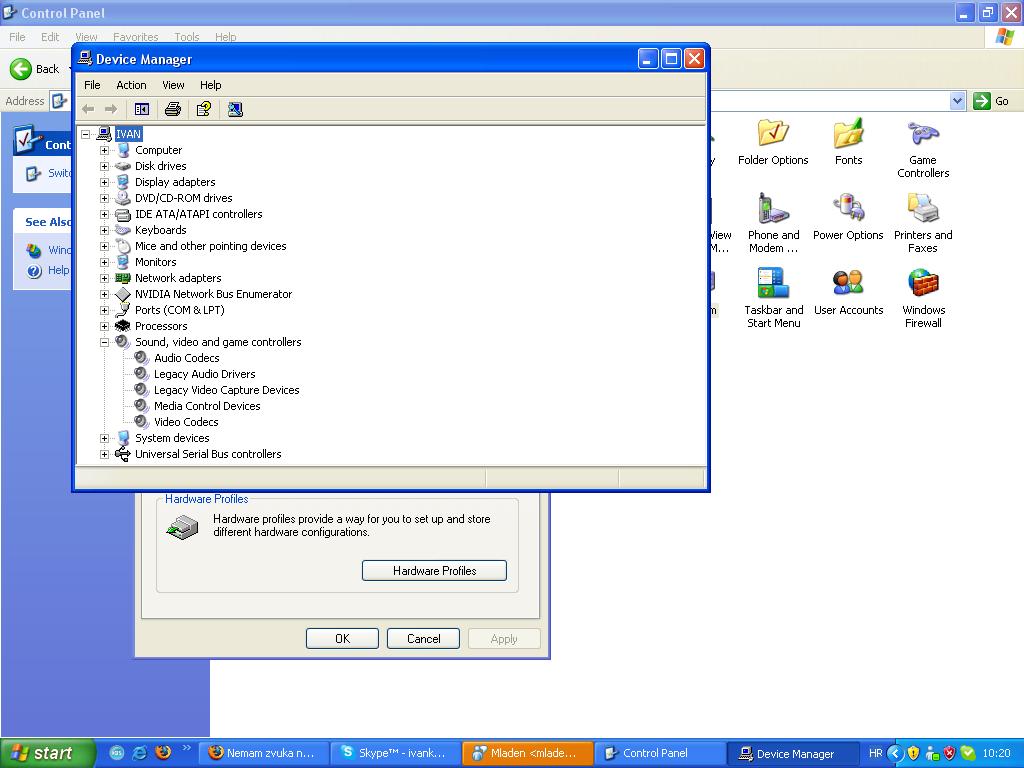 Koliko vidim u device manageru je sve OK, daj screenshot tog di piše "no audio device". Probaj u device manageru stisnuti: "search for new hardware" to je ona ikonica kompjutera sa povećalom. Pa javi šta se dogodilo. I probaj staviti drivere za zvučnu sa cd-a koji si dobio uz matičnu, ako ga imaš. |