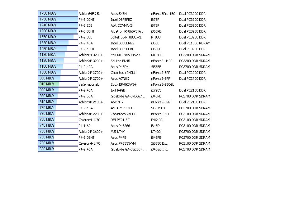 Intel ce tu imat bolje rezultate, al su njegovi i za ATHLON XP puno premali. Ja sa ddr 333 klokanom na 400 Mhz(cl3 , 4,4,11) imam 1160 pisanje i 3000 citanje. Citiraj: