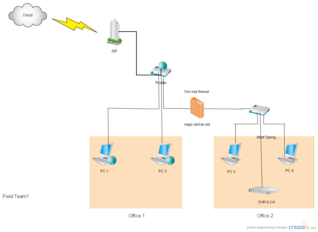 Ruter ima bežičnu vezu sa PC kasa. Jedan port vodi na "glavni" računar. U drugi port dolazi mrežni kabal od DVR-a. Iz trećeg porta vodi kabal na računar u starom ofisu i ostane mi još 4 port kao rezervni.