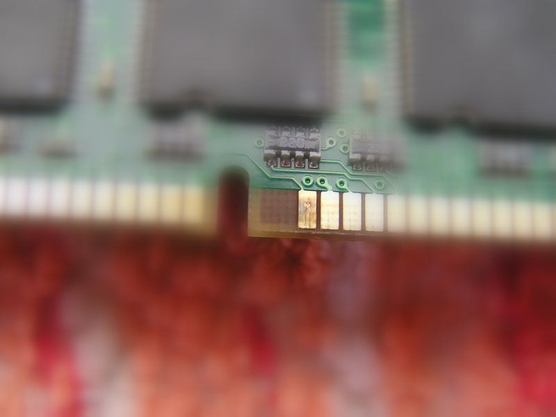 Evo i slika 256 DDR RAM-a koji su stradali zbog toga. Iskrenja su vidljiva na 10-tak pin-ova s obje strane modula. (na slici jedan takav) |