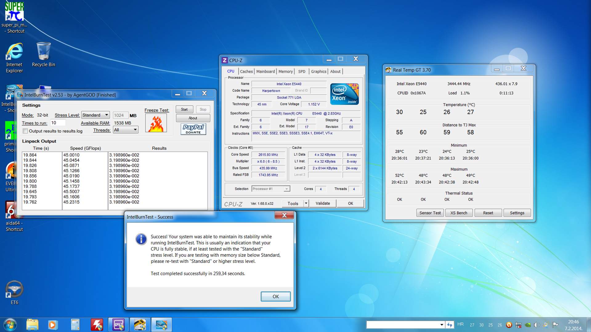 Evo, kod mene definitivno memeorija zeza. Dakle E5440 EO revizija. 455x8,5-prolazi, prime i intelBurn test 460x8,5- ruši se nakon 9min. Probao sam sa manjim množiteljem 460x6 kako bi isključio procesor kao razlog nestabinosti, ali ista stvar. Inače prezadovoljan, evo kao što se vidi iz slika, temperature u loadu odlične, Vcore-1,104-1,130 Čini mi se da ima odličan OCpotencijal... A ovako ga držim za 24/7 436x8.5=3700MHz Vcore-podešeneo u biosu na Normal Stabilan... |