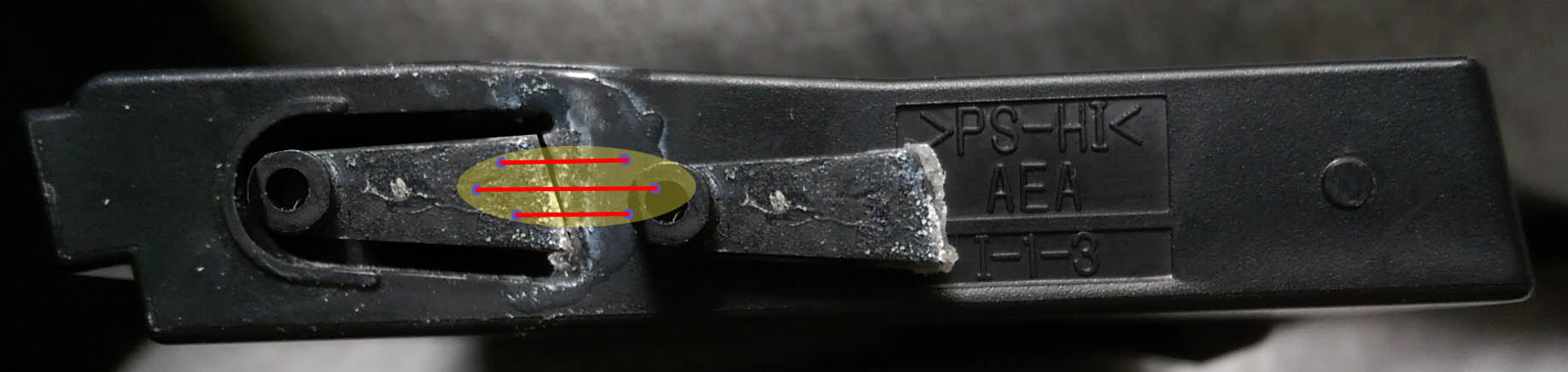 trebao bi probati "armirati" ljepilo sa tankom žicom, nekad zna pomoći. Iako čini mi se dosta nezgodno za zalijepiti pošto je na nezgodnom mjestu. i možda epoxy ljepilo bude bolje. ili pogledaj ovaj video sa stapanjem žice u plastiku https://www.youtube.com/watch?v=ziPutFi1BlI