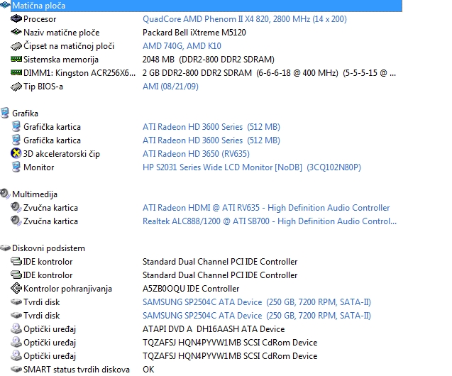 Pozdrav drustvo! Imam problem sa ram memorijom radi mi samo jedan slot od moguca 4. Samo prvi radi kad stavim ram u njeg, u ostalim slotovima racunar se upali ali samo kuleri i nista drugo kad stavim dvije plocice isti slucaj!? Maticna ploca je Packard Bell iXtreme M5120 procesor QuadCore AMD Phenom II X4 820, 2800 MHz (14 x 200) a ram DIMM1: Kingston ACR256X64D2U800C6L 2 GB DDR2-800 DDR2 SDRAM (6-6-6-18 @ 400 MHz) (5-5-5-15 @ 333 MHz) (4-4-4-12 @ 266 MHz), a ima 4 slota za ram memoriju samo prvi najblizi procesoru cita karticu probao sam i neke od 1gb ista situacija kako i sa ovim kingstonovim plocicama od 2Gb inace imam dvije iste. Interesuje me da li imaju ovakvu manu ako je neko cuo ili je razlog neki manji problem ili podesavanje... Evo i slika o konfiguraciji |