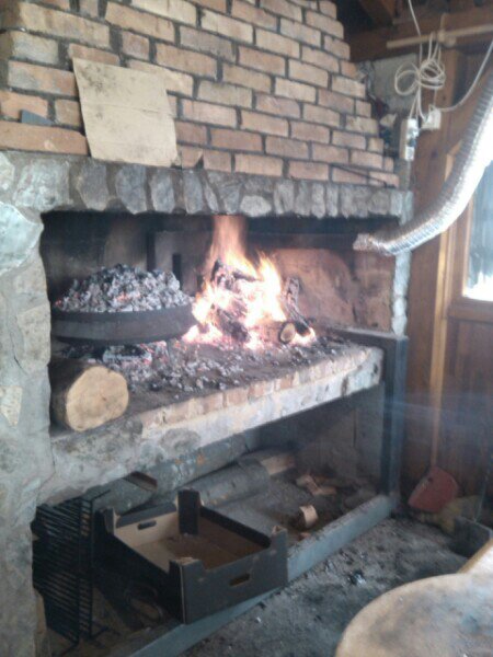 Vatra je tu najvise za ogrijati se, a manjim dijelom je za peku. Vidi se iza vatre sustav cijevi koji grije cijelu konobu.