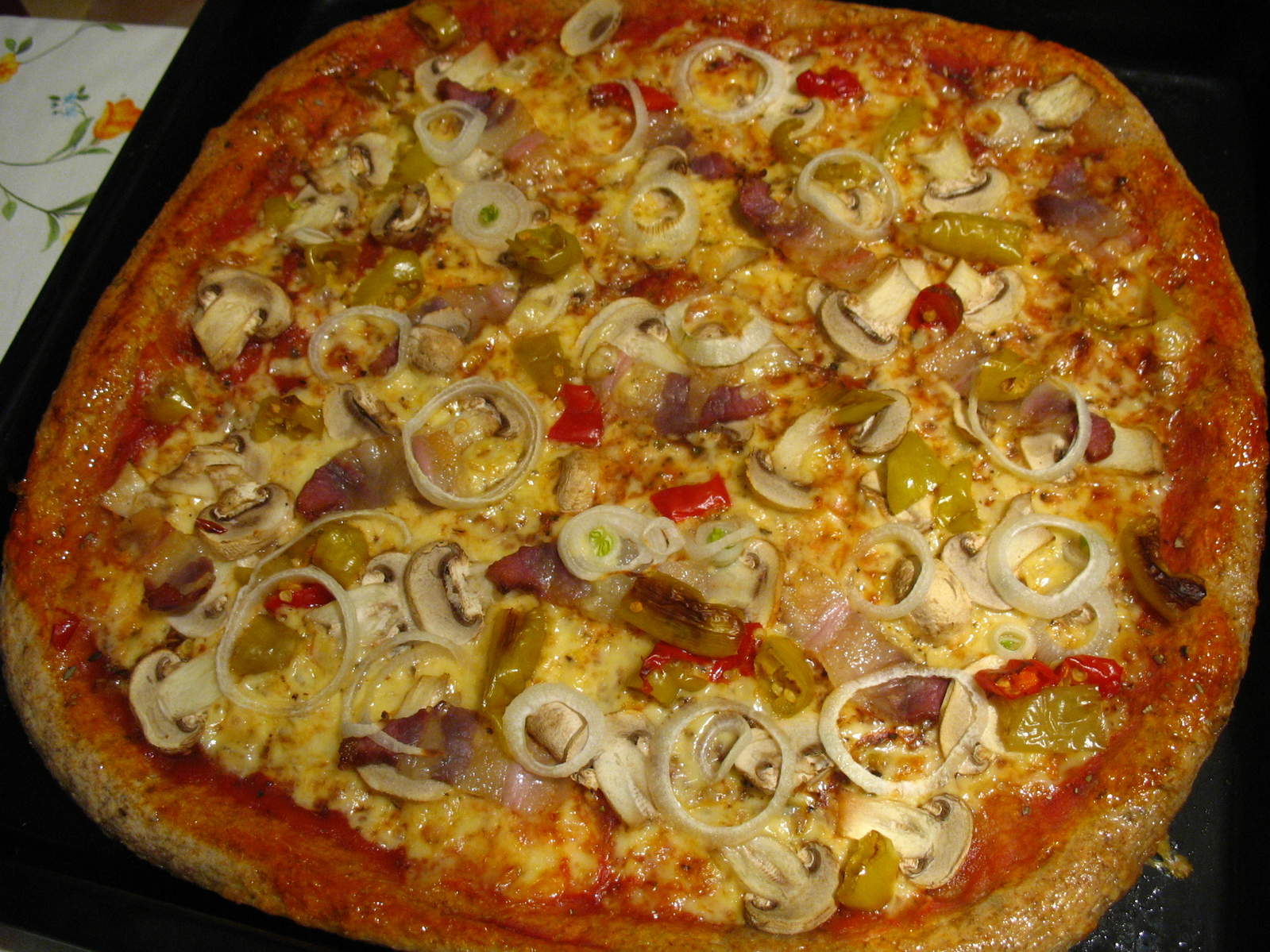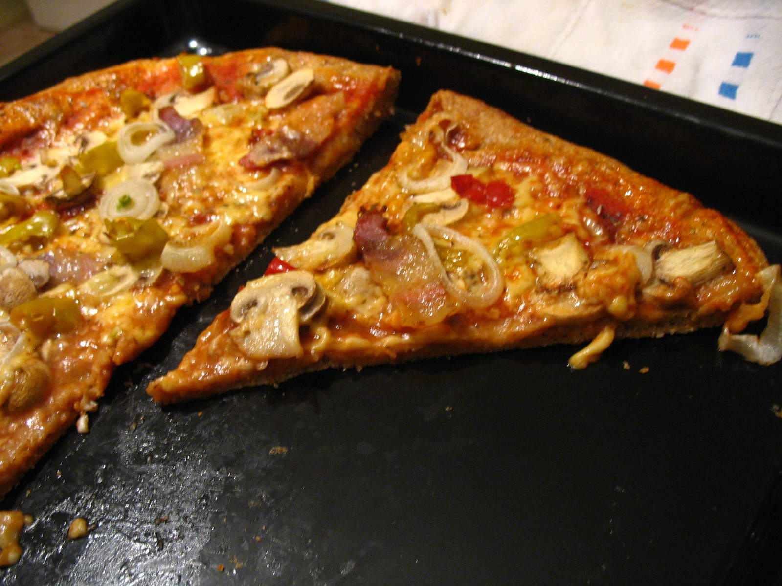 "i don`t always eat pizza, but when i do i prefer pizza addiction" nakon dva mjeseca, večeras sam ispekao dvije pizze. lijevo je funghi (sir, šampinjoni, origano) a desno seljačka (sir, šampinjoni, slanina, blagi feferoni, luk, origano).