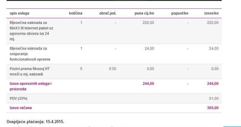 MAX3 S + dodatne opcije Ugovor na 24 mjeseca 269 kn/mj +30 kn/mj* Taman tih 30kn koje HT bere bi bilo OK da ih nema ![]() Zadnje izmijenjeno od: Jole911. 27.08.2015. u 21:44. |