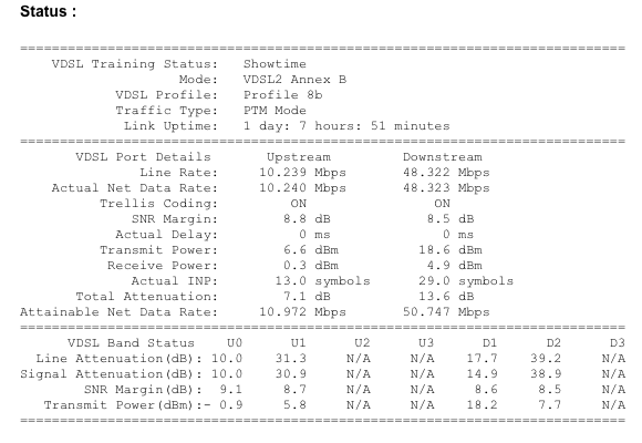 Spojeno je prema G.992.1 annex B standardu kojem je maximum 8 Mbit/s downstream i 1.3 Mbit/s upstream, nadam se da nije bas tak' losa parica.