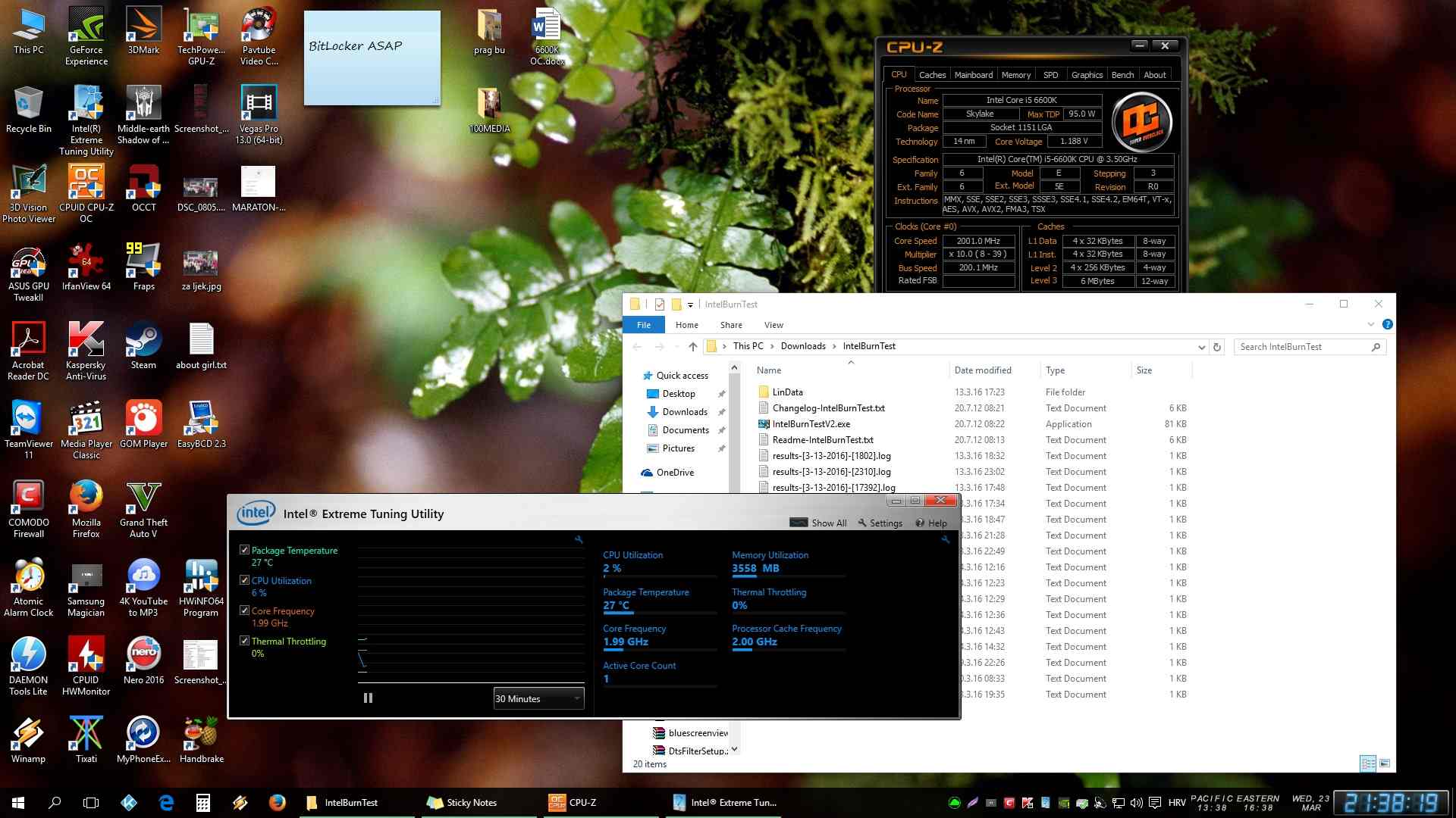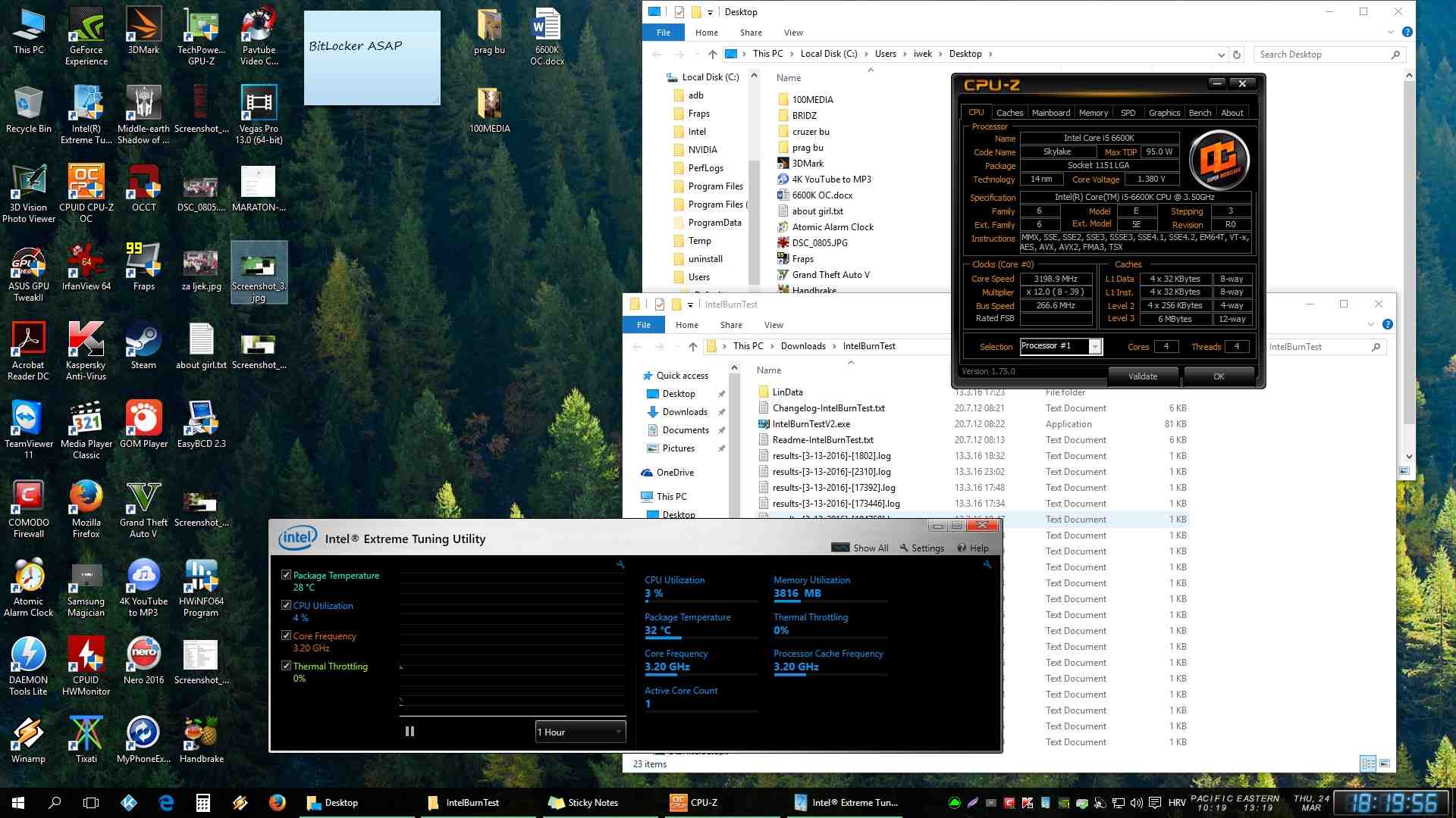 E sad da vas zasipam sa informacijama uvezi 6600K. Dani lete ko ludi a nikako da zapisem neke dojmove odma na forum kak sam testirao a eto potrajalo je 2tj i jos mi je ostao OC memorije sljedecih par dana, al to je najlaksi dio.. Pa da pocnem. Gigabyte je izbacio zadnji official UEFI(bios) nakon 3 i pol mjeseca(ver. F6) za moju plocu i moram priznati ispravili su velke musice koje su se dogadjale ko npr kad restartam komp ploca se izblesira i ode u bootloop(jedino clearcmos pomaze, kad udjem natrag u bios nemam sejvanih profila, a tek kad jos jednom restartam bios oni se natrag pojave nekim cudom). Ili npr odem u bios, nis ne promjenim, odaberem exit without saving changes, enter, i ploca opet ode u bootloop. Pa eto ispravili su to sve i konacno sam mogao sa puno manje zivciranja isprobavati sve zive settingse koje mi ploca ima za ponudit. Prvo sam se bacio na clockanje BCKL-a. Trebalo mi je tjedan dana istrazivanja po forumima da skuzim zasto nemogu samo tak odvrnut BCKL na 200, smanjit multie od meme, cachea i jezgri. Nije bio problem ni u voltazama, ni u visokom bckl nego u omjeru koji je davao memoriji takt makar sam multi od memorije stavio najmanje. Fora je u tome da je ddr4 stock clock 2133 i kad napravite clear cmos ploca ce dati taj takt RAM-ima. Ok, uzimam visoke tajminge(16-16-16-36 T1), stavljam 1.34v na rame reda radi i POST-am natrag u uefi. Dignem bckl na 125, sejvam i ploca normalno boota. E sad krenem ja dalje dizat i dodem do zida negdje oko 160mhz na bckl. Nakon dosta proucavanja, igranja sa naponskim settingsima i dobrih par sati proucavanja i trazenja kaj je to PLL core overvoltaze( i to kod mene ima samo offset setting bez da mi pise kolka je stock vrijednost) dolazim do zakljucka da bi bilo dobro kod dizanja bckl pogoditi taj stock ddr4 clock(2133). Da bi to napravio kod visokog bckl moram staviti neki multiplier na memu 10, lupam 213.30 bckl i molim Boga da ce mi ploca POST-at. I eto proslo je. Nakon otkrivanja tople vode Mogo sam jos tu izvuc veci bckl da sam isao na stock clock mojih corsair stickova(2666mhz) al mi je vec ovo uzelo dosta vremena a i bio sam zadovoljan rezultatom. Cilj toga svega je vidjeti dal dobivam brži cache na procu dizanjem bckl-a(jer tak je slucaj bio kod gore spomenutog AMD APU-a i iz svega sam saznao da nema nikakve razlike dal je bckl 100,200 ili 300. Da bi se iskoristilo povecanje bckl, takt memorije mora biti jako visok da ne dode do bottlenecka izmedu proca i meme sta sam doznao googlajuci.. E sad dolazim dalje na problem, brzina pci lanea ciji je stock kod moje ploce 800mhz(oznaka mu je system agent clock ili univerzalno FCKL). Podizanjem bckla logicno je i fckl otiso gore, racunao sam na to al posto je gigabyte malo glupo to odradio kod moje ploce se moze odabrati 3 postavke(400-800-1000mhz na FCKL) nisam mislio da ce otici gore ako to u biosu ostavi netaknuto jer mi je bilo logicno da makar dizem bckl to ostaje isto i ploca sama prilagodava fckl multiplier prema visem bckl. Na taj problem sam naletio kod 220+mhz na bckl. Razbijam glavu i uocim u HWinfo da je fckl otiso u nebesa(1700mhz) Spustam setting u biosu na 400mhz i u windowsima mi HWinfo pokazuje 800i nesto sitno. Ok nastavljam dizati bckl i dolazim do tog max clocka od 266.60. E sad za sve one koji se krenu igrati sa BCKL, kod npr bckl od 200.1 probao sam staviti ravno 200 i nije bootalo jer mema onda nije dobila taj omjer za 2133mhz takt. E bas zbog toga mi se nije dalo igrati dalje sa bckl jer sam skuzio da su ovi iz Intela ipak majstori i taj 100mhz stock bckl ipak ima smisla a ovo ostalo je sve igranje.. Svaki put kad sam spustio multiplier na memi jer sam povecao bckl clock sam na procesoru odredio 2 takta(2.9GHZ i 3.2GHZ) otiso u windowse i napravio mem test sa aidom i 3dmark firestrike da vidim dal ima kakvih promjena u performansama. A posto Intel funckionira malo drugacije od AMD-a na kojem sam dizanjem bckl dobio na brzini cachea u ovom testu nije bilo nikakve razlike. Odlucujem vratiti bckl na 100 zadovoljan sa rezultatima i infromacijama koje sam saznal, te krecem sa max clockom koji mogu izvuc iz proca. 6600K hladim sa noctuom NH-U9B special edition2 pa nisam ocekival da budem mogel dignut voltaze do neba al sam se nadal barem 5GHZ. Posto sam naletil na odlican primjerak koji bez problema vrti 4.6ghz core i cache na 1.280v, podignem taktove na 4.7 i stavim 1.30, bootam u win, pokrenem IntelBurnTest i javi mi gresku. Ok dodajem jos voltaze i pokusavam te sa 1.32v prolazim 5runova na veryhigh settingu a drop voltaze kod full loada je 0.08 te mi je to dovoljna potvrda da je stabilno. Prije nego krenem testirati 4.8ghz vracam clock na 4.6 a cache(Uncore) stavljam na 3.5ghz i testiram sa aidom da vidim kolki je pad u perfomarnsama. Odvrtim tak i sa uncorom na 4ghz,4.3,4.4 i 4.5. Razlike su minimalne te spustam uncore na 3.5ghz i stavljam core na 4.8 jer time oslobadam dio voltaze za jezgre te se nadam da nebudem moral prelaziti 1.4v za 4.8ghz... Ok stavljam 4.8 sa 1.37v i lagano testiram dok ne dodem do stabilne voltaze za bootanje u windowse od 1.39v. Na 1.39 otvaram IBT i pokrecem 3run-a na HIGH te na zadnjem runu javlja gresku. Vec tu je temperatura dosla na 95C te razmisljam dal da idem dalje ili ne. Reko ajd runovi su dosta kratki pa idem probati. Stavljam 1.4v i dobivam stabilan OC na 4.8 te na IBT prolazi 3 runova na high bez greske. ALI cekam trenutak kad procesor pocne termalno trothlat i zato imam cijelo vrijeme otvoren intelov XTU koji mi na grafovima lijepo pokazuje da na zadnjem runu dolazi do 4% throtla na 98C. To mi govori da nejdem dalje te odlucujem da je to najveci OC dok jednog dana ne prijedem na vodeno.. Istestirao sam 4.8ghz na GTA V, 5 sati igranja, temperatura sa ventovima do daske je 60C a na standard brzini je max 71C... Kod testiranja bckl-a multi na procu je bio 8x te je takt bio jako nizak ali sam cijelo vrijeme tog testiranja bckla voltazu drzao na 1.3. Tek kad sam odlucio napraviti one spomenute testove sa 2.9 i 3.2ghz sam voltazu d