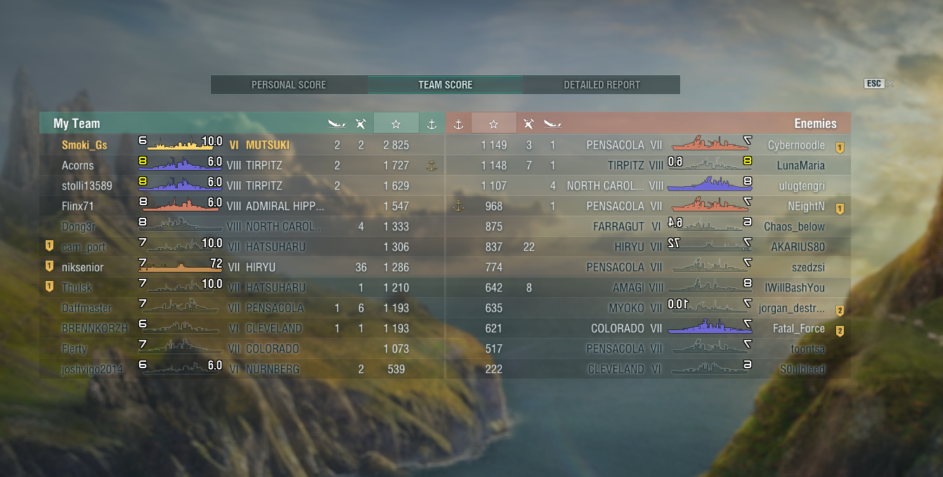 Dobro se plovilo popodne, nema kaj. Nevjerojatno da ja ne mogu složit dobru partiju sa CV-ima ako nisam u diviziji. Ranije danas u prvih 5 minuta mi potope 8 brodova u timu. I kak da ja onda dobivam partije sa CV-ima?!? Srećom tu su Smoki & Mitra uskočili. ![]() --- Par fotki koje sam ovako nasumično uzeo iz igre (Alt + G za micanje sučelja): ![]() ![]() - Ove zadnje dvije su iz zadnje partije danas, kad smo nas trojica pratili diviziju 2 x Colorada. Bilo je gusto do samog kraja. |
