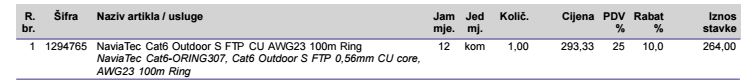 Ezy ima u ponudi: NVT-CAT5E-ORING301, Cat5E FTP Outdoor 0.5CU AWG24, 100M Ring 260 kn nabava.net onaj koji ti je nudio protis je isto od ezy-ja pa probaj ih nazvat i pitati točnije vrijeme isporuke, nije nikad 100 dana. |