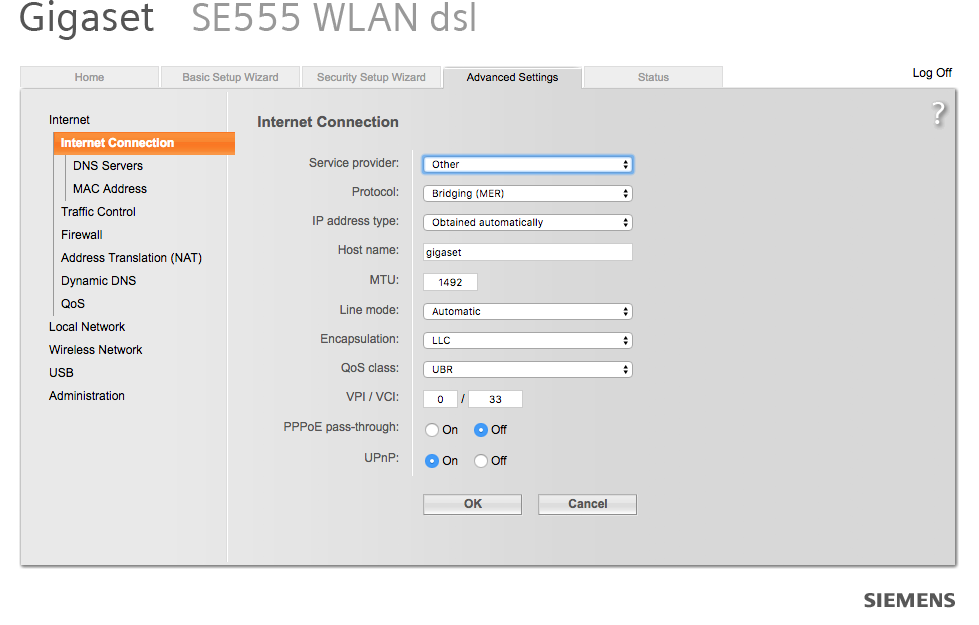Siemens Router je samo tu radi Wifi. A PC je spojen s kablom na glavni vipov modem preko kabla i na LAN1. Router je spojen na glavni na Lan2.
