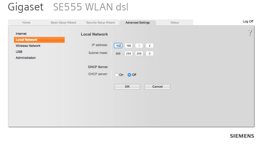 Da, glavni vip router (192.168.1.1) je spojen s kablom s siemensom (192.168.1.2). Kabel je u lan1.